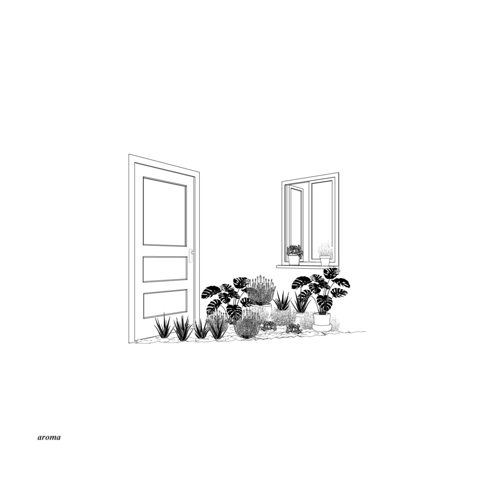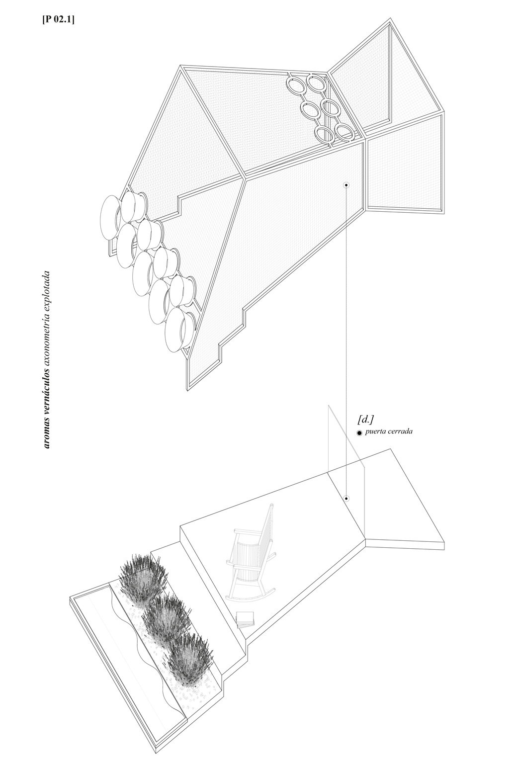 /como tercer modelo arquitectónico se propone un espacio que conduce a la experiencia aromática que ofrecen plantas típicas del área mediterránea. El aroma de la lavanda, del romero y de la alhábega son los aromas que frecuentemente aparecen en los recuerdos de mi infancia. El diseño de este modelo se basa en potenciar la percepción de estos aromas gracias a un aumento de temperatura en la superficie de las plantas, de modo que este se mezcla con las partículas de humedad, intensificando su poder. Esto se debe al efecto de los rayos de sol que se reflejan en la lámina de agua e inciden sobre la vegetación. Asimismo, en la entrada se produce una compresión espacial que obliga a la persona que quiera entrar a tener que entrar agachado lo que, combinado con la apertura de la puerta /rotación vertical/, provoca que el flujo de aire se dirija hacia dicha persona. Este sistema de apertura y cierre de la puerta de acceso actúa como una válvula reguladora del flujo de aire. Es decir, cuando abrimos la puerta para entrar estamos cerrando —inconscientemente— la salida natural de la brisa; por ello, su recorrido natural modifica su curso y, así, salir por la puerta de acceso. De esta forma, cuando una persona se dispone a entrar —en posición semirreclinada debido a la altura de acceso— recibe la brisa que, previamente, ha recogido el aroma a lavanda. Así, la arquitectura, en su dimensión condicionante de la posición del cuerpo, actúa como mecanismo que potencia y alberga la fragancia de mi memoria: el aroma a lavanda./
