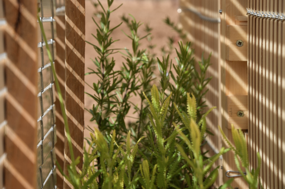 [a.] envolvente: plancha de policarbonato blanco ondulado [b.] estructura: perfiles de acero de 80x80mm y 5mm de espesor y travesaños de 80x40mm de acero y 50mm de espesor [c.] conos: chapa metálica [d.] pavimento: tablaero hidrófugo de madera OSB 15mm [e.] vegetación: salvia rosmarinus [romero], lavandula angustifolia [espliego, comunmente conocida como lavanda]