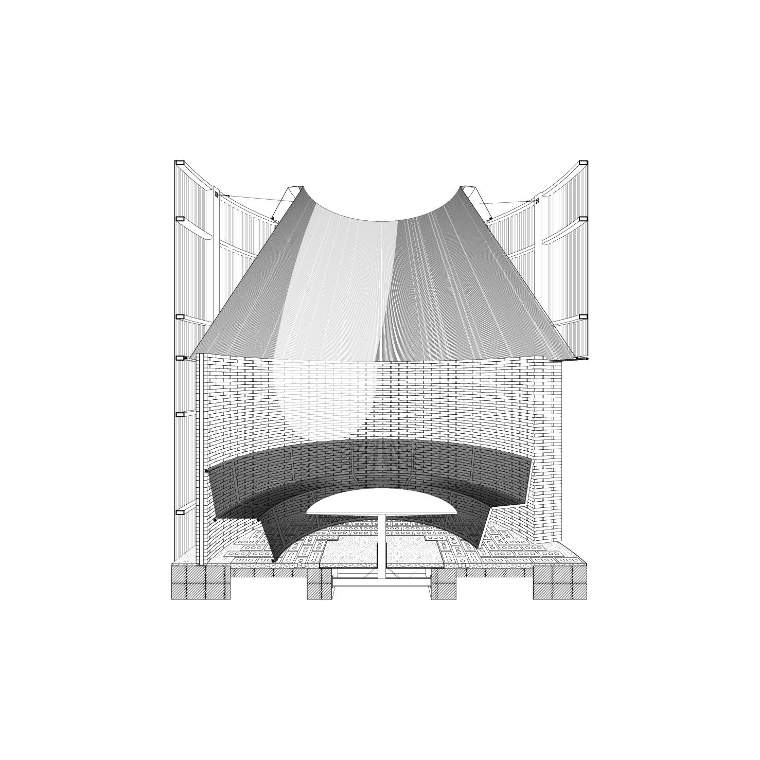 [a.] envolvente - sistema de fachada. capa exterior: chapa pegaso de acero galvanizado de10mm de espesor y 1m de ancho, capa interior: muro de ladrilo cerámico macizo de 238x112x37mm anclado mediente perfil tubular metálico que atraviesa dos de sus tres perforaciones [b.] estructura: perfiles de acero de 100x100 mm y 5mm de espesor y travesaños de 80x40mm de acero y 50mm de espesor [c.] cúpula formada por 2600m de cuerda de papel de 6mm [d.] banco formado por 2300m de cuerda de papel de 6mm y perfil tubular de Ø40mm [e.] pavimento: ladrillo cerámico macizo de 238x112x37mm sobre base de mortero y relleno de juntas con arena fina de color [f.] mesa: cilindro telescópico regulado manualmente - sistema aplicado de towerlift usado para escenografía
