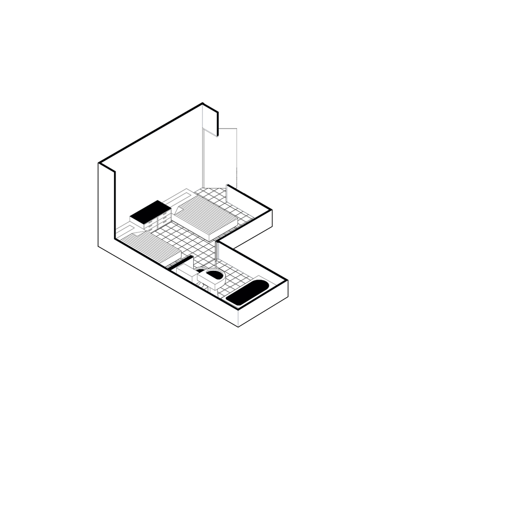 /en el tercer modelo arquitectónico se trabaja con la búsqueda de una experiencia en la que el agua actúa como mecanismo de distorsión espacial. Para ello se propone un espacio de penumbra que, a modo de preparación, obliga a la retina del ojo a tener que adaptarse a este cambio de luz. Al final del corto recorrido en recodo, se encuentra una bañera en cuyo interior se dispone una apertura exterior que obliga a la luz a atravesar el volumen de agua, de forma que esta sufre una distorsión y entra en el interior en forma de reflejos.