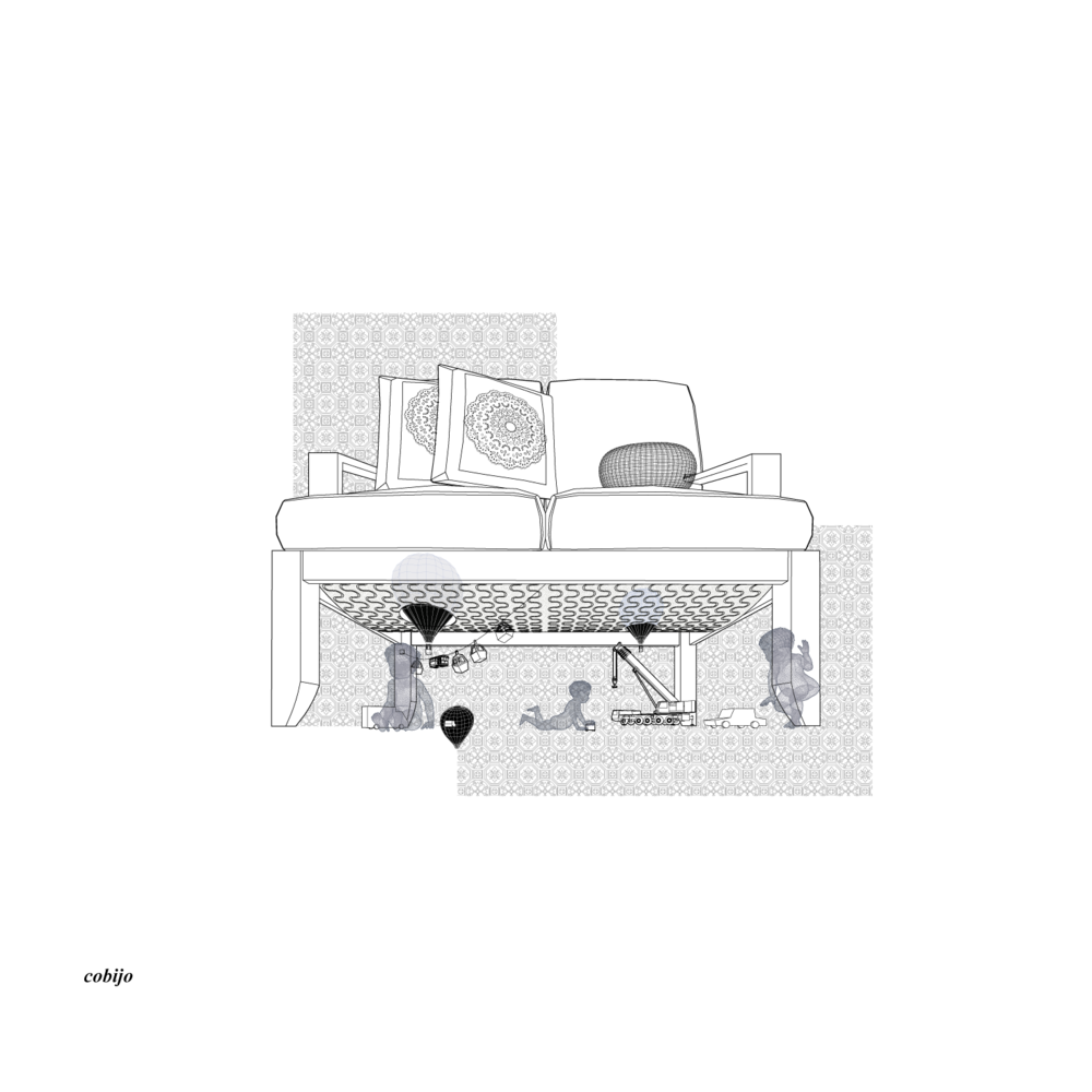 /frente a la posibilidad de que mis primos o cualquier otra persona que fuera a casa de mis abuelos en mi ausencia pudiera cogerme los juguetes, me agencié el hueco ‘residual’ que quedaba bajo el sofá: nadie miraba ahí nunca. así es como este mueble albergaba mi guarida secreta, mi pequeño cuarto de juegos dentro de lo que —aparentemente— se reconocía como un salón/