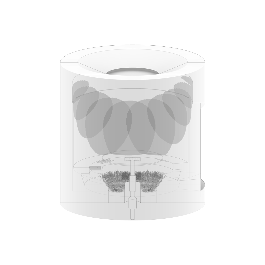 fase 3_ en la tercera fase de diseño se recuperan las partes elementales con las que se trabaja en la fase 1 y se integran en un único modelo: la mesa camilla como mecanismo espacial y temporal; la lámina de agua como elemento que captura y distorsiona la luz solar mediante los haces de luz reflejados en el interior del espacio; el jardín compuesto por plantas vernáculas, cuyo diseño potencia el flujo de aire con el aroma que desprenden las plantas; el espacio ‘escondido’ y protegido, como cobijo del niño. Por otro lado, se continúa con el desarrollo del modelo para la observación de la lluvia de meteoros.