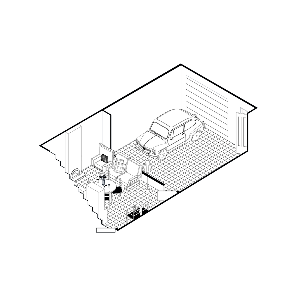 /el garaje se adapta para albergar una sala de visitas en la entrada, de esta forma se genera una estancia de carácter semiprivado debido a las numerosas visitas que reciben de los vecinos. Se establece un nuevo límite entre el límite exterior e interior de la vivienda. ya no se dispone de coche/