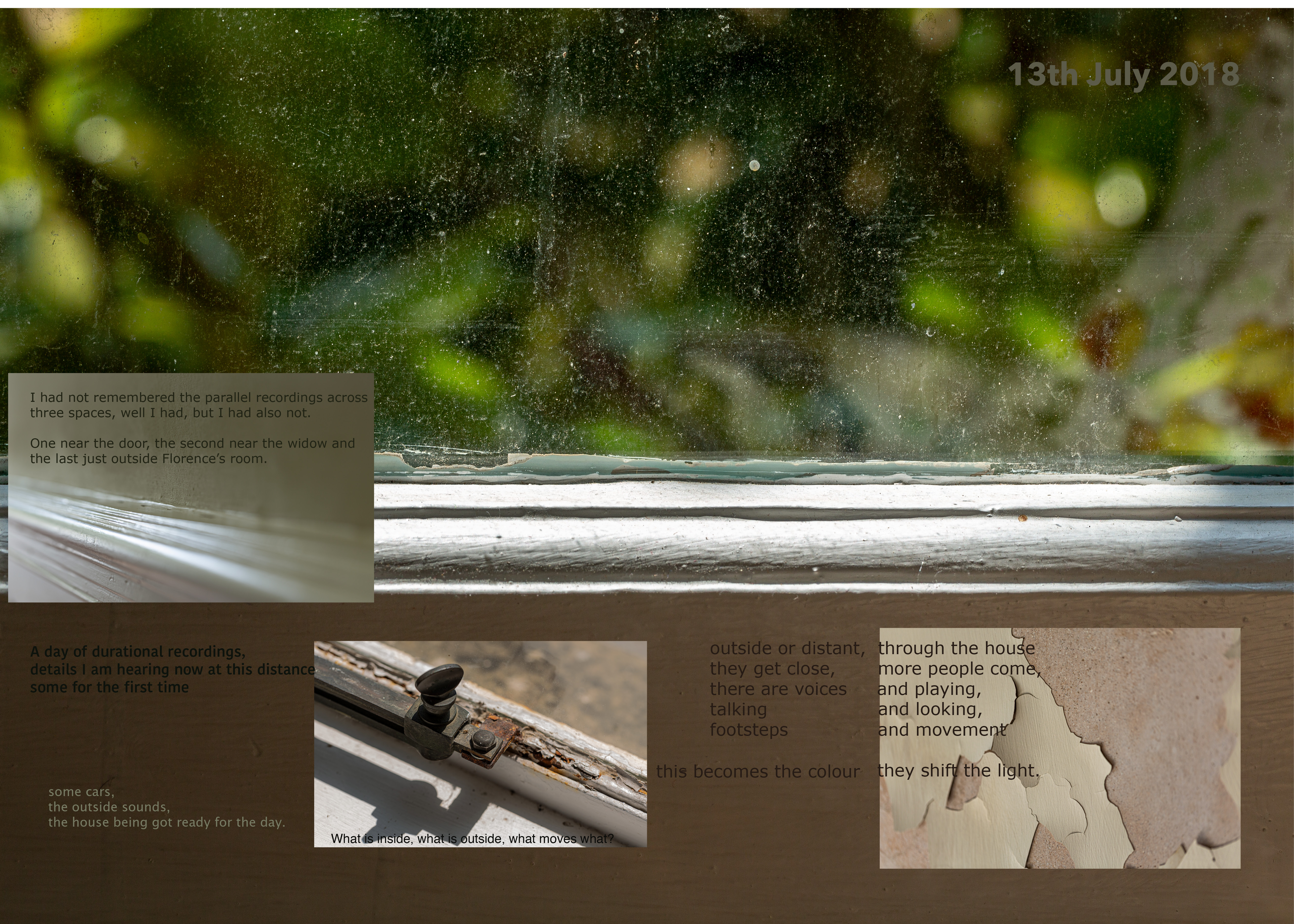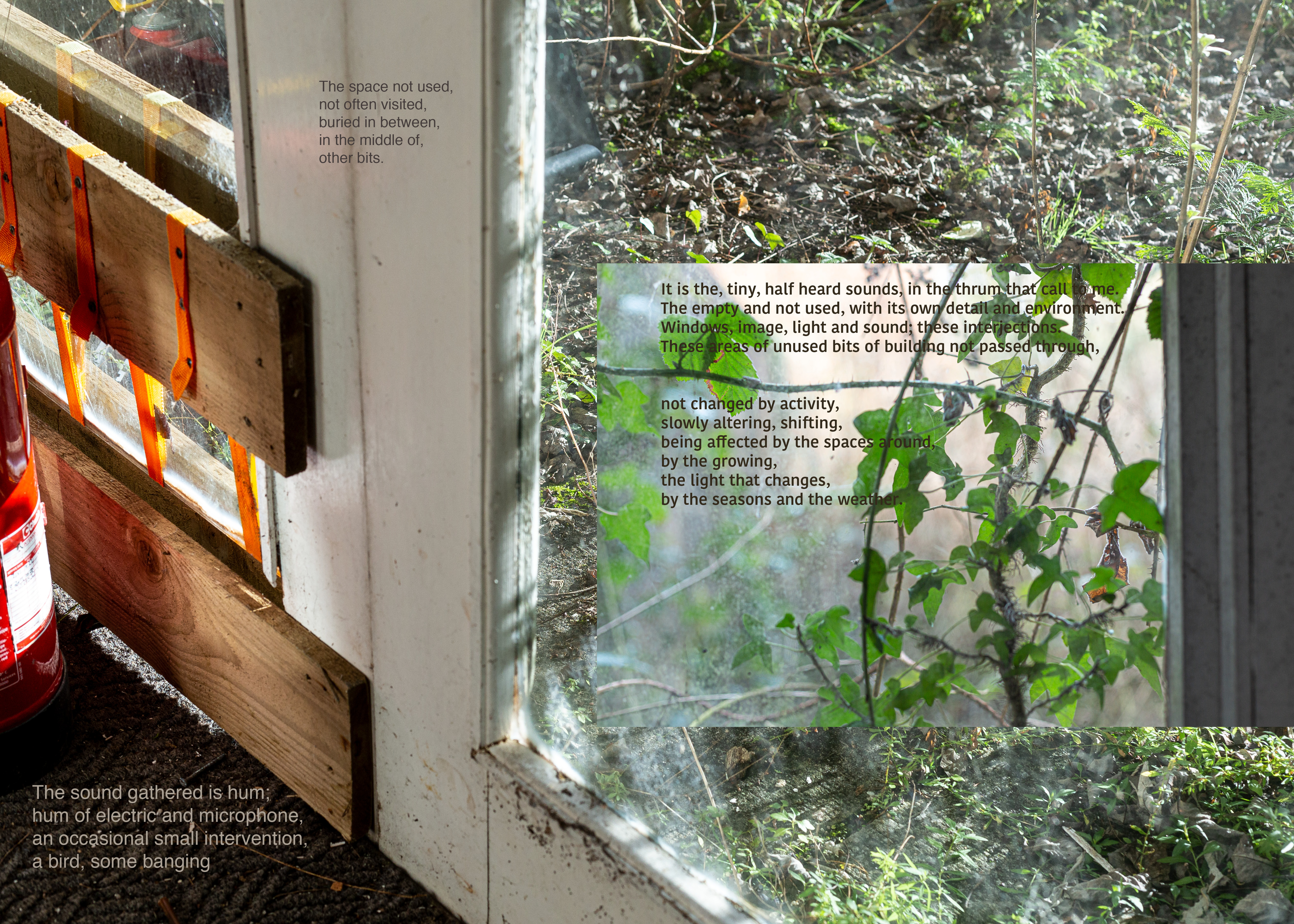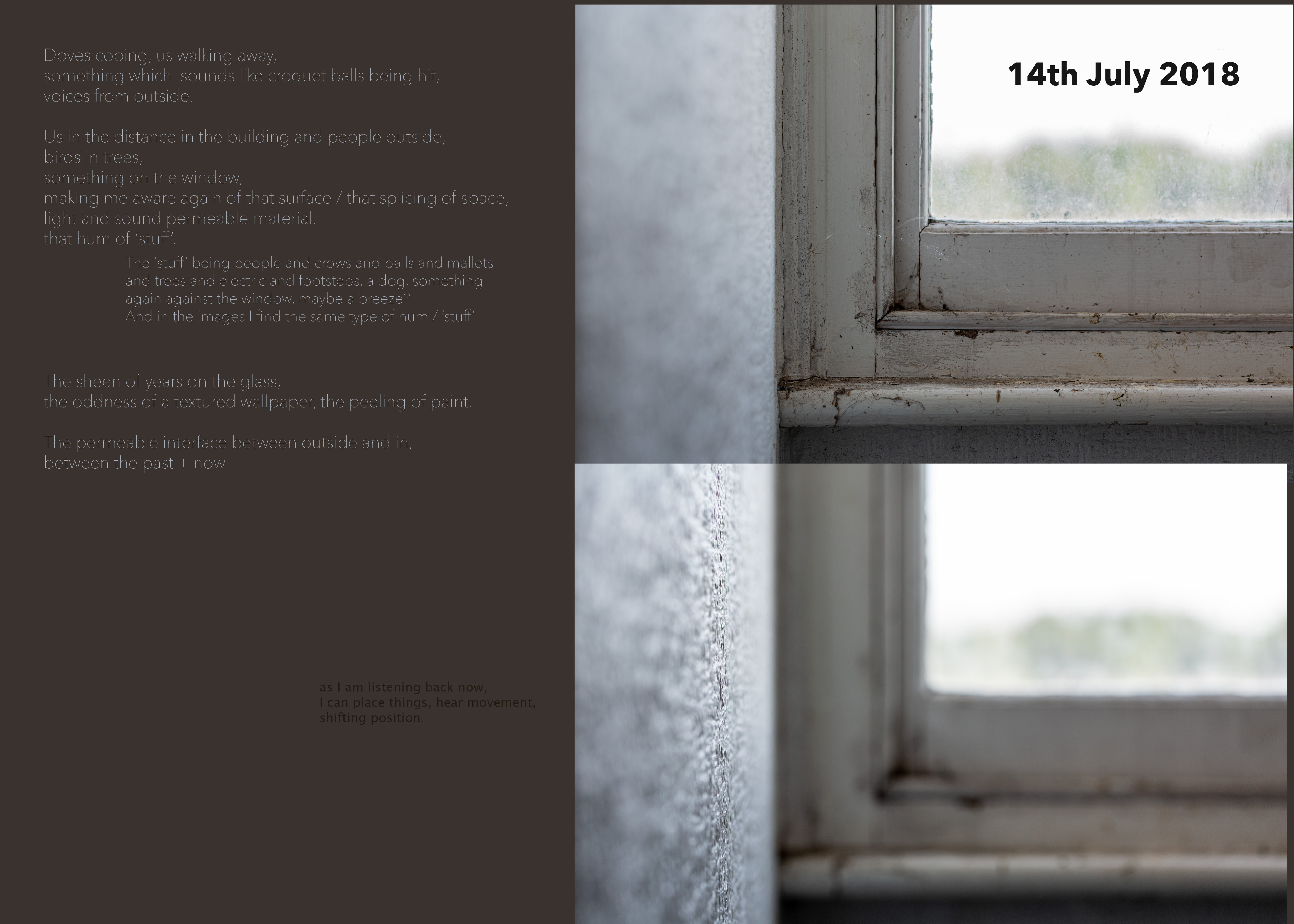 The intense revisiting process was pivotal in my noticing ‘qualities’ in the materials. In the images, shallow focus, shifted and blurred images through windows, sharp details, colours and tones. Paralleled in the audio, points that felt ‘bright’ and clear, and ‘atmospheres’ of many sound elements. In the audio these are shifting, new elements coming into play, details becoming merged with others. These ‘qualities’ there because of the decisions I made in the gathering - the kit, the attenuation of a mic or the aperture of a lens. Having at the time gathered stuff in ways that bodily stimulated my senses, I had not until this point, consciously considered my decision making in relation to the materials.
