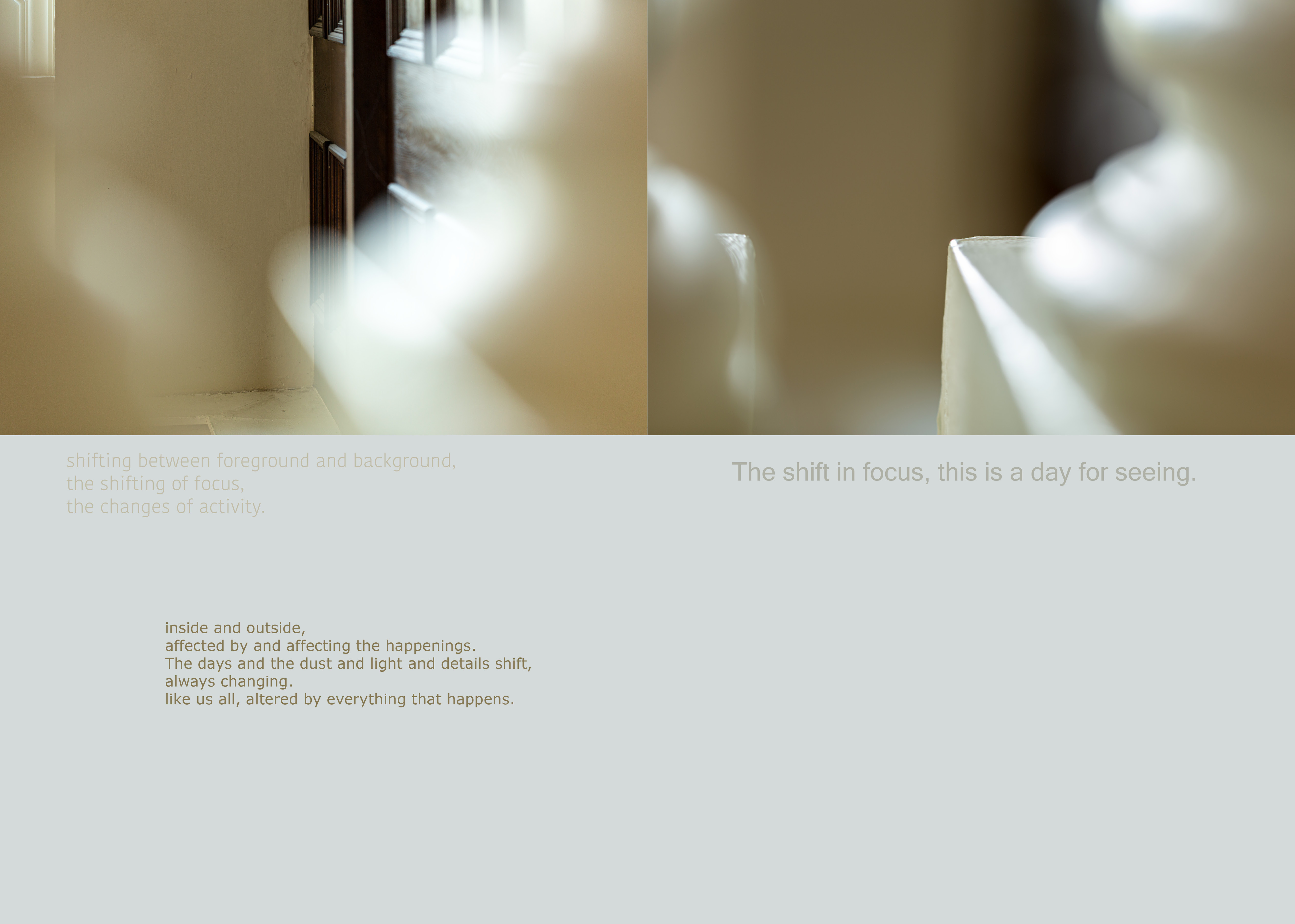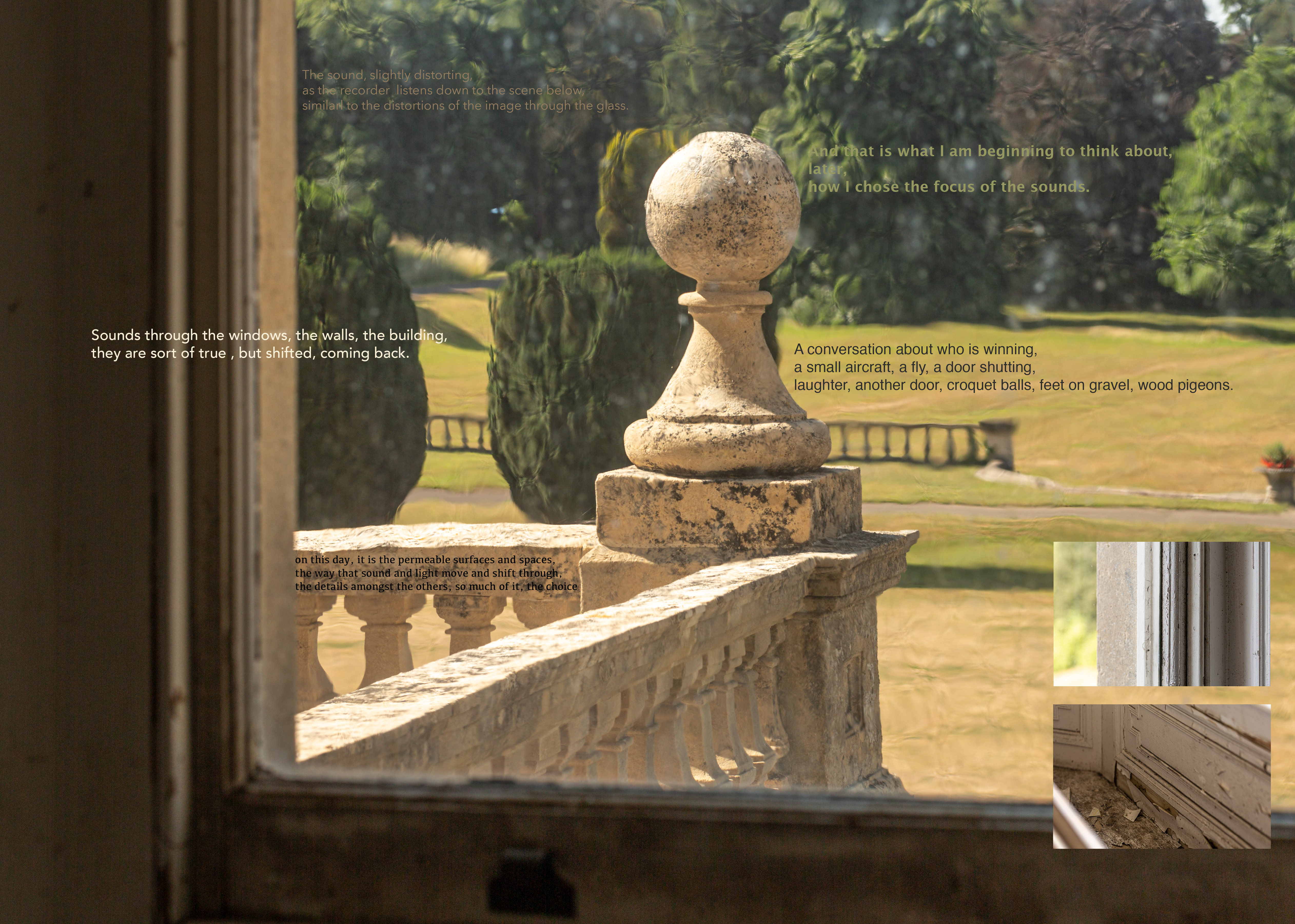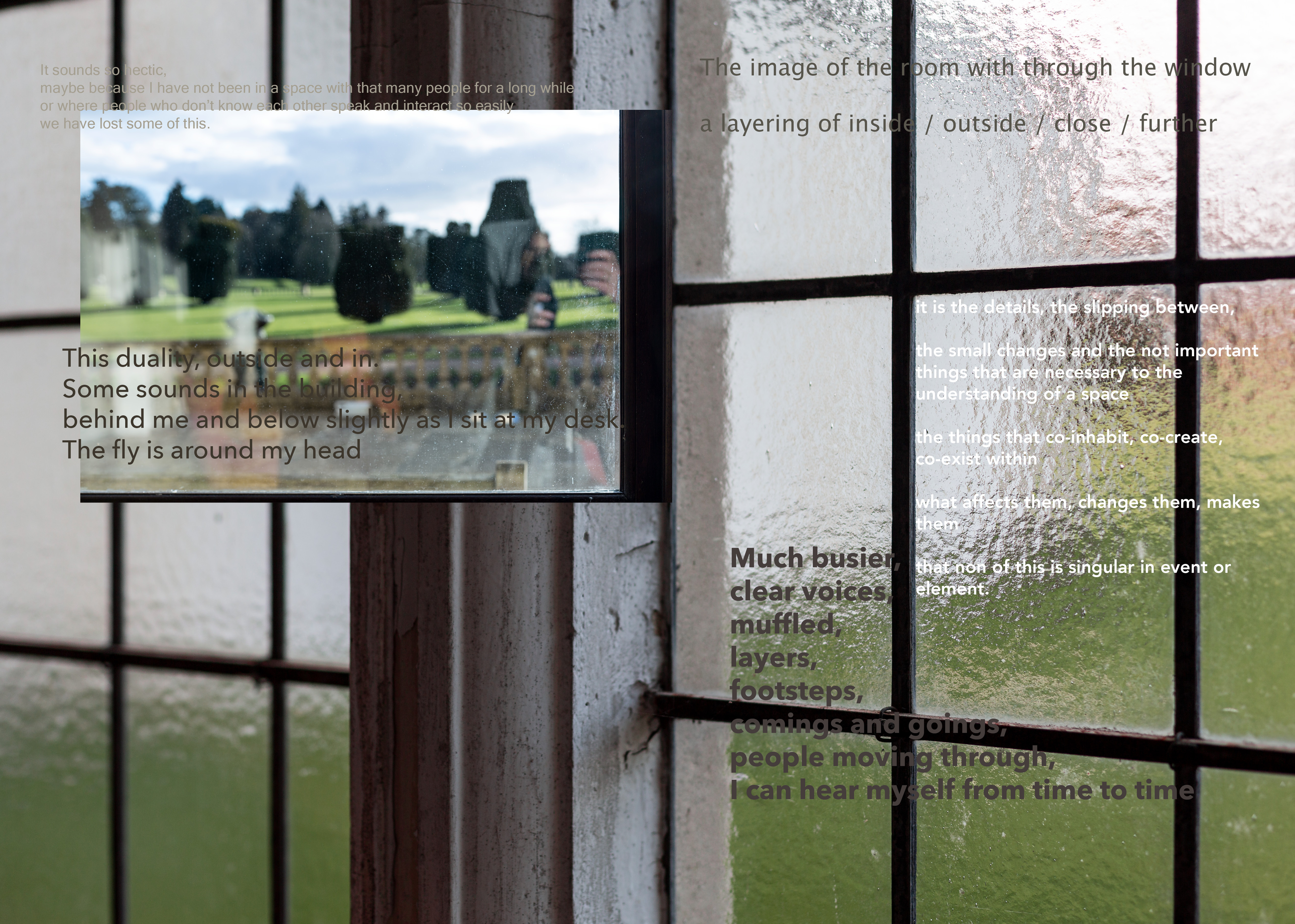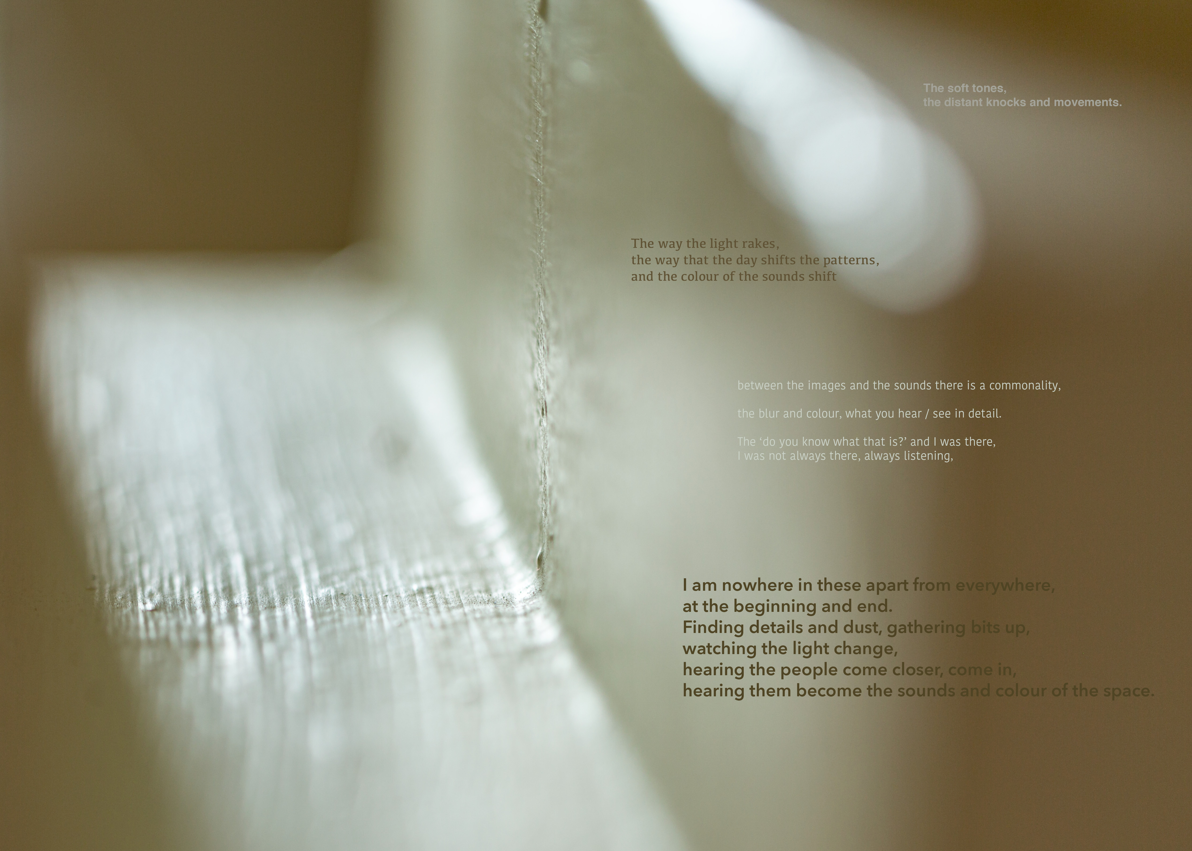 The intense revisiting process was pivotal in my noticing ‘qualities’ in the materials. In the images, shallow focus, shifted and blurred images through windows, sharp details, colours and tones. Paralleled in the audio, points that felt ‘bright’ and clear, and ‘atmospheres’ of many sound elements. In the audio these are shifting, new elements coming into play, details becoming merged with others. These ‘qualities’ there because of the decisions I made in the gathering - the kit, the attenuation of a mic or the aperture of a lens. Having at the time gathered stuff in ways that bodily stimulated my senses, I had not until this point, consciously considered my decision making in relation to the materials.