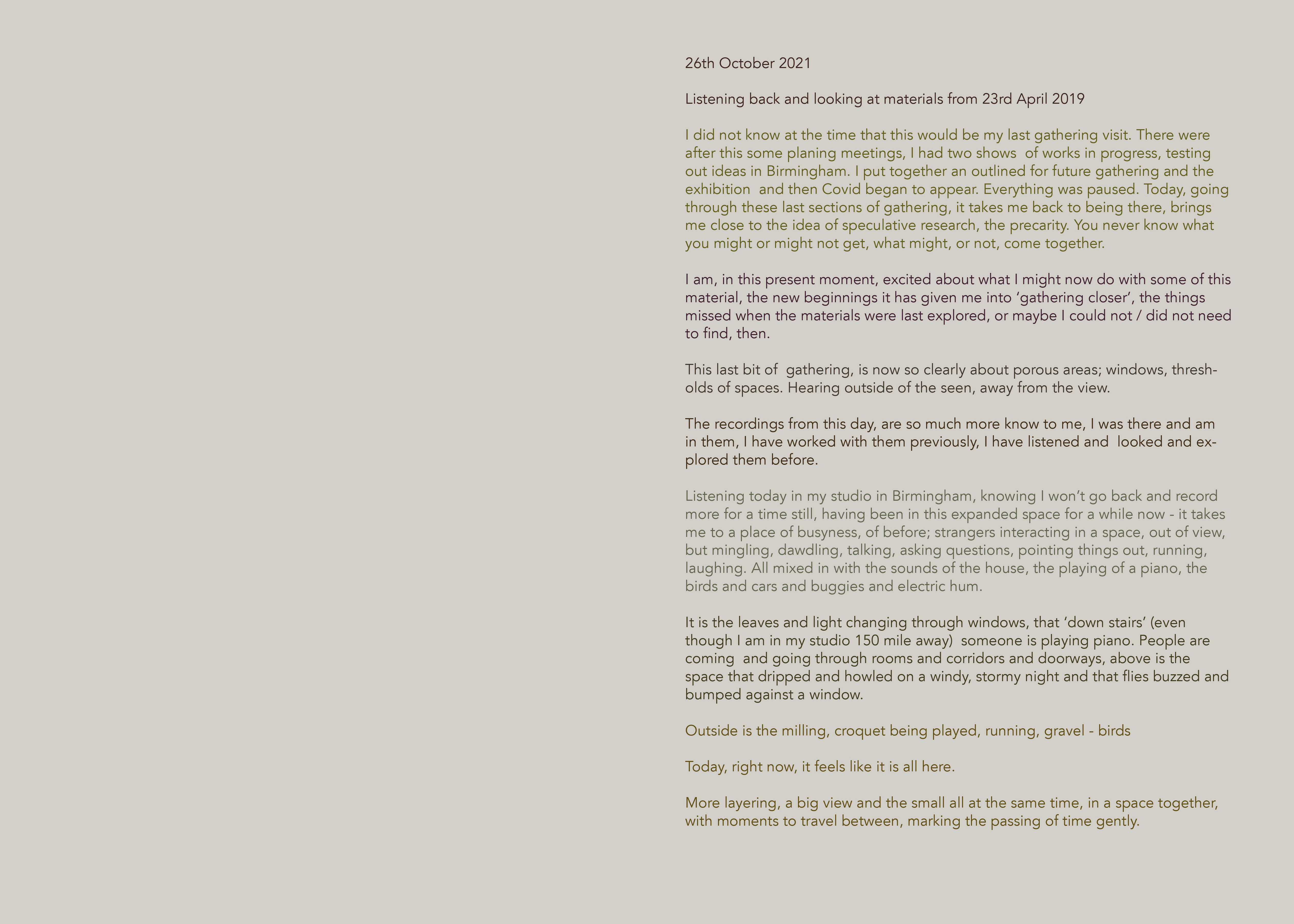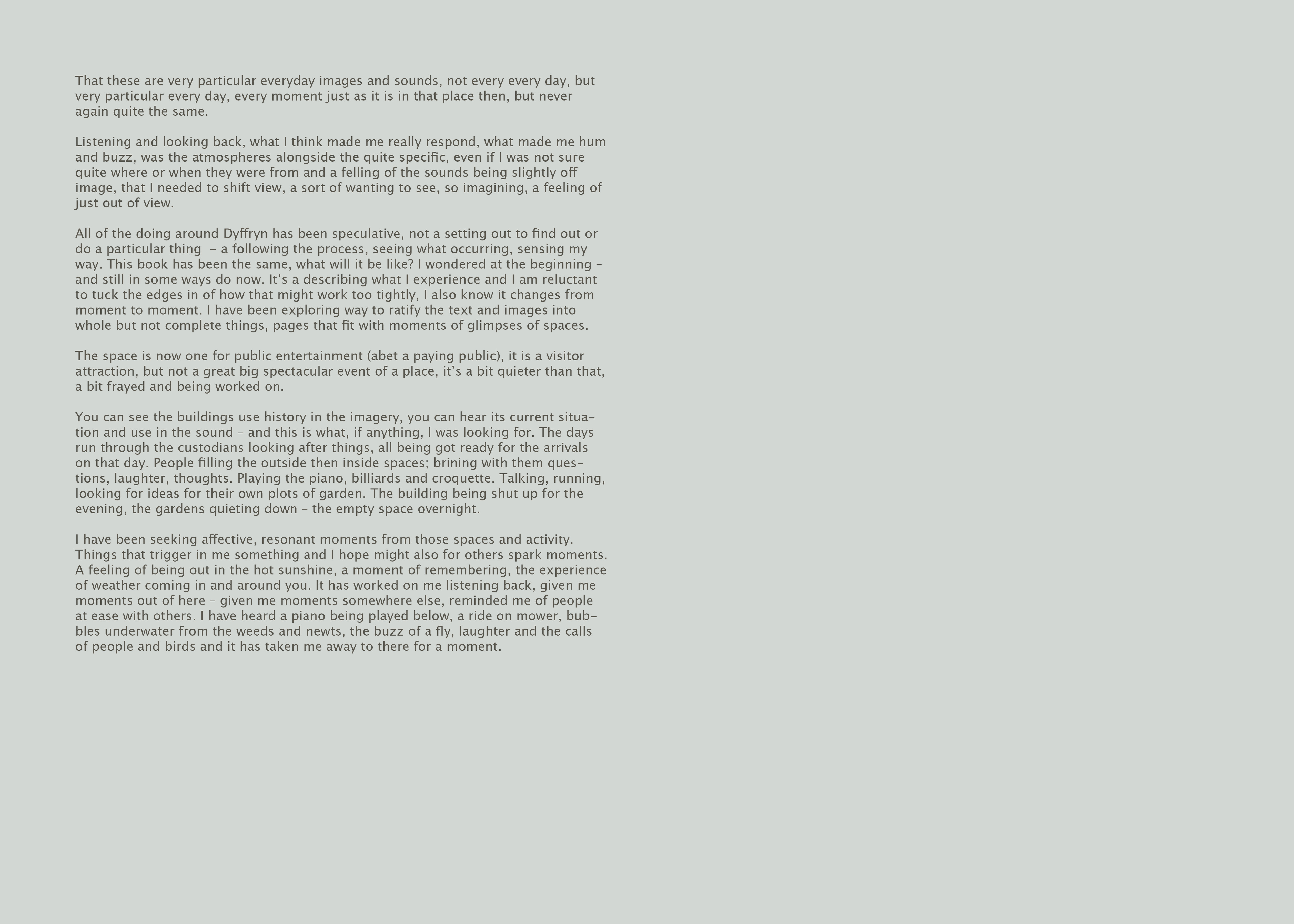 At times I had never liked just being somewhere as much as I liked ‘being there’ in the re-visiting. It gave me a way to ‘travel, I drew into myself all I could from the materials, stepped bodily into them and the journey they took me on. The permeability between my ‘bodymind’, the materials and my studio environment, caused moments of feeling in ‘that’ space (Dyffryn), and concurrently in my studio - as I heard myself type, move my feet on the bar of my stool, aware of the street to my right. At points, I felt not sure what of my experiencing in that moment were ‘in’ Dyffryn or ‘here now’.