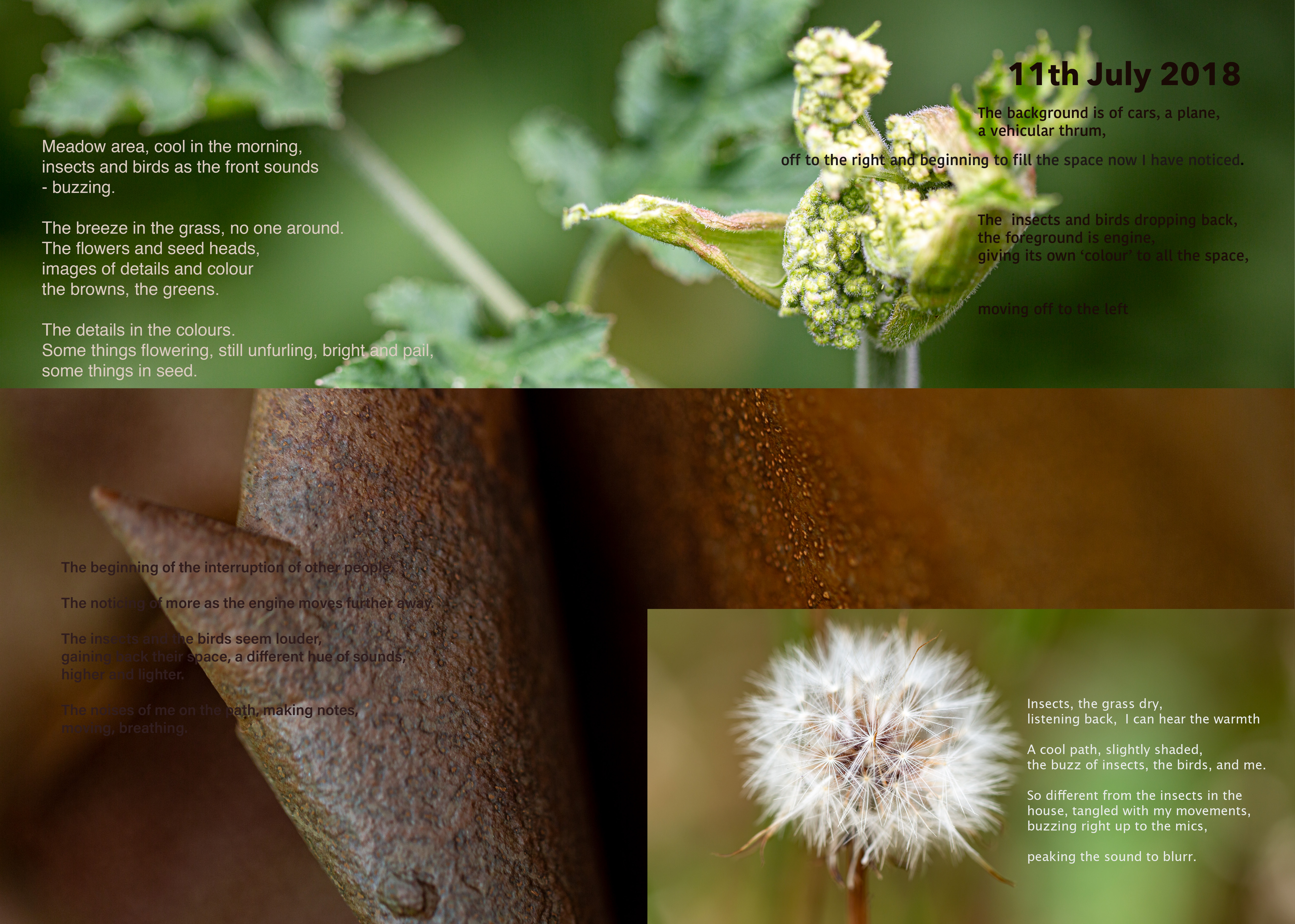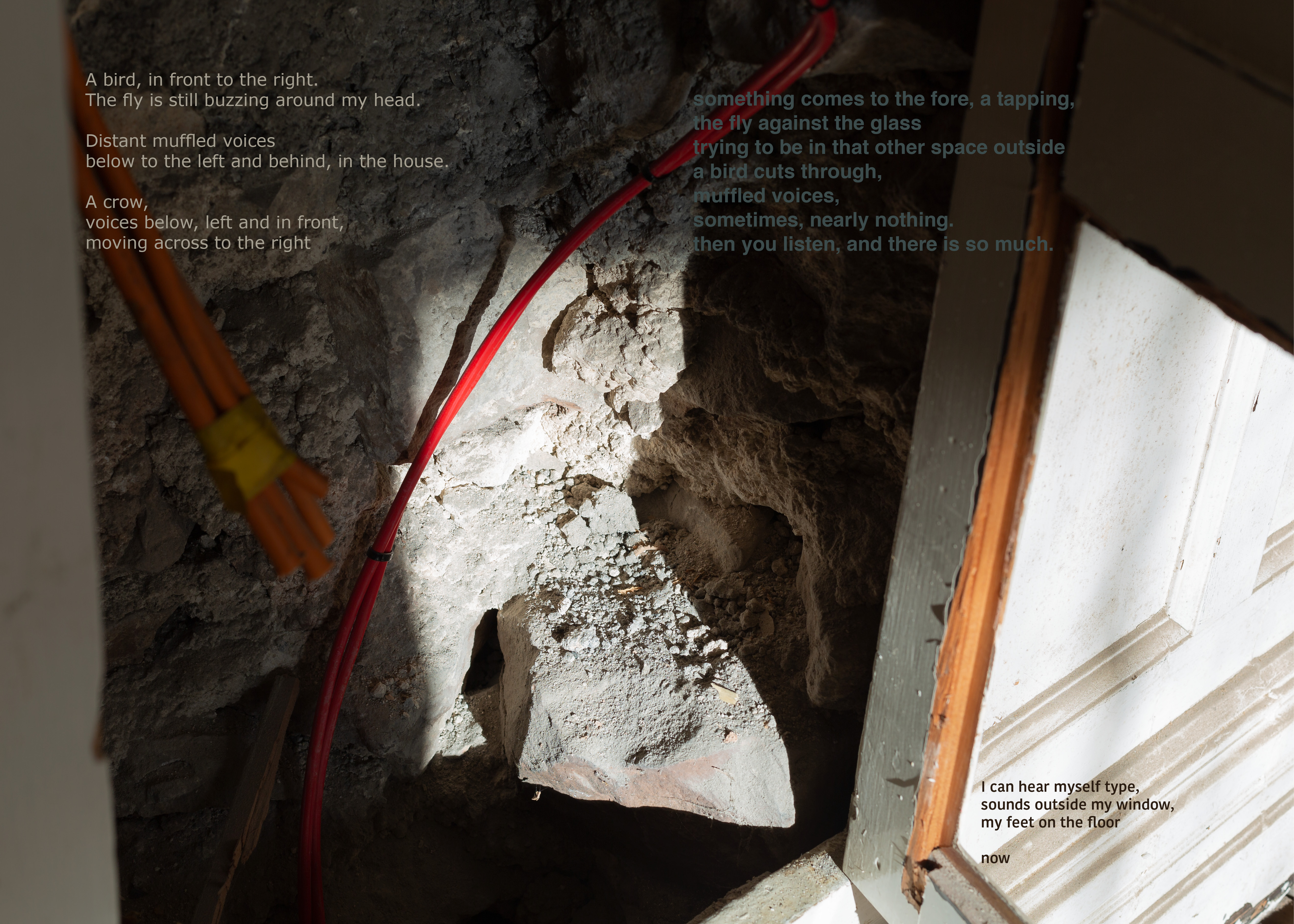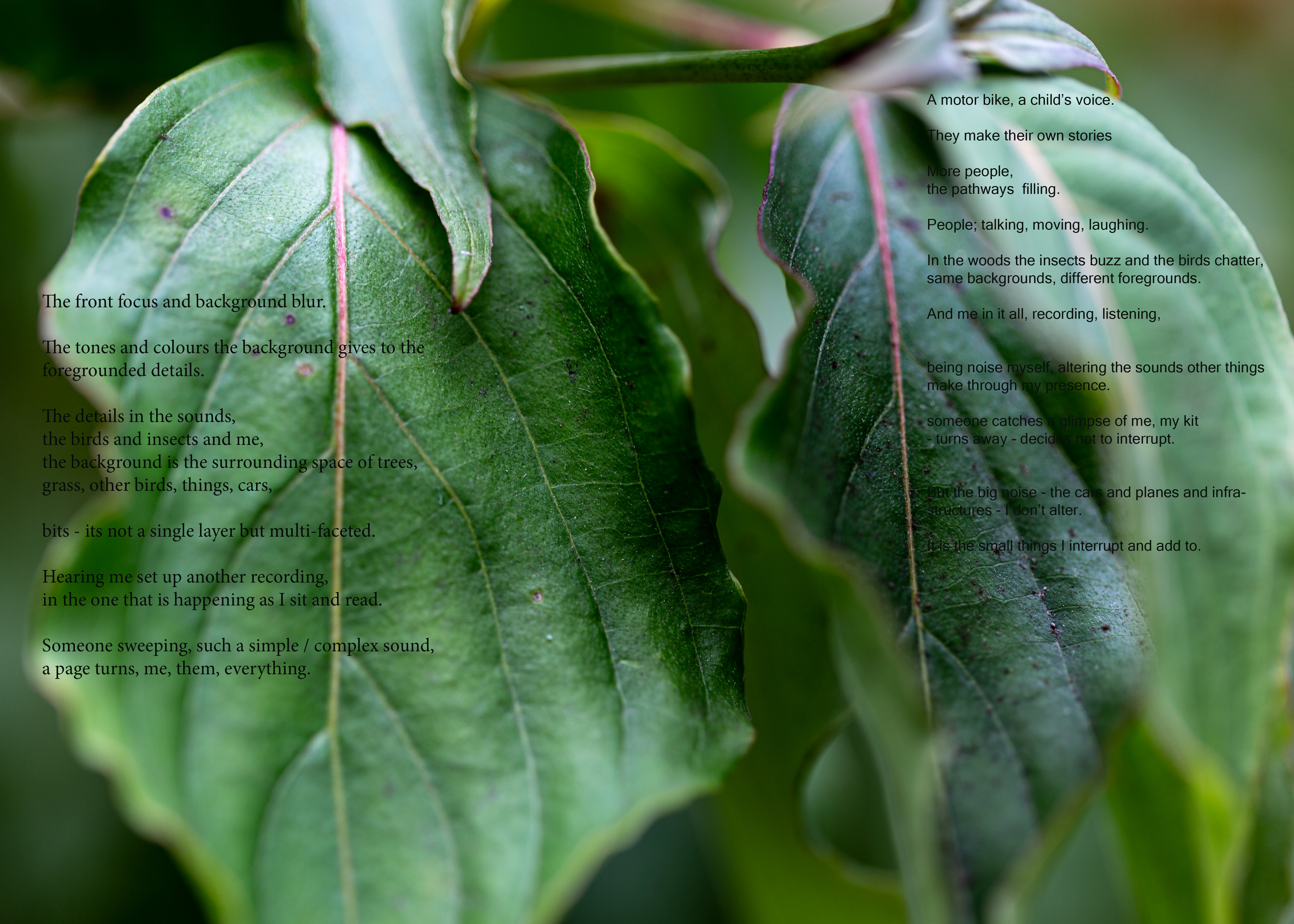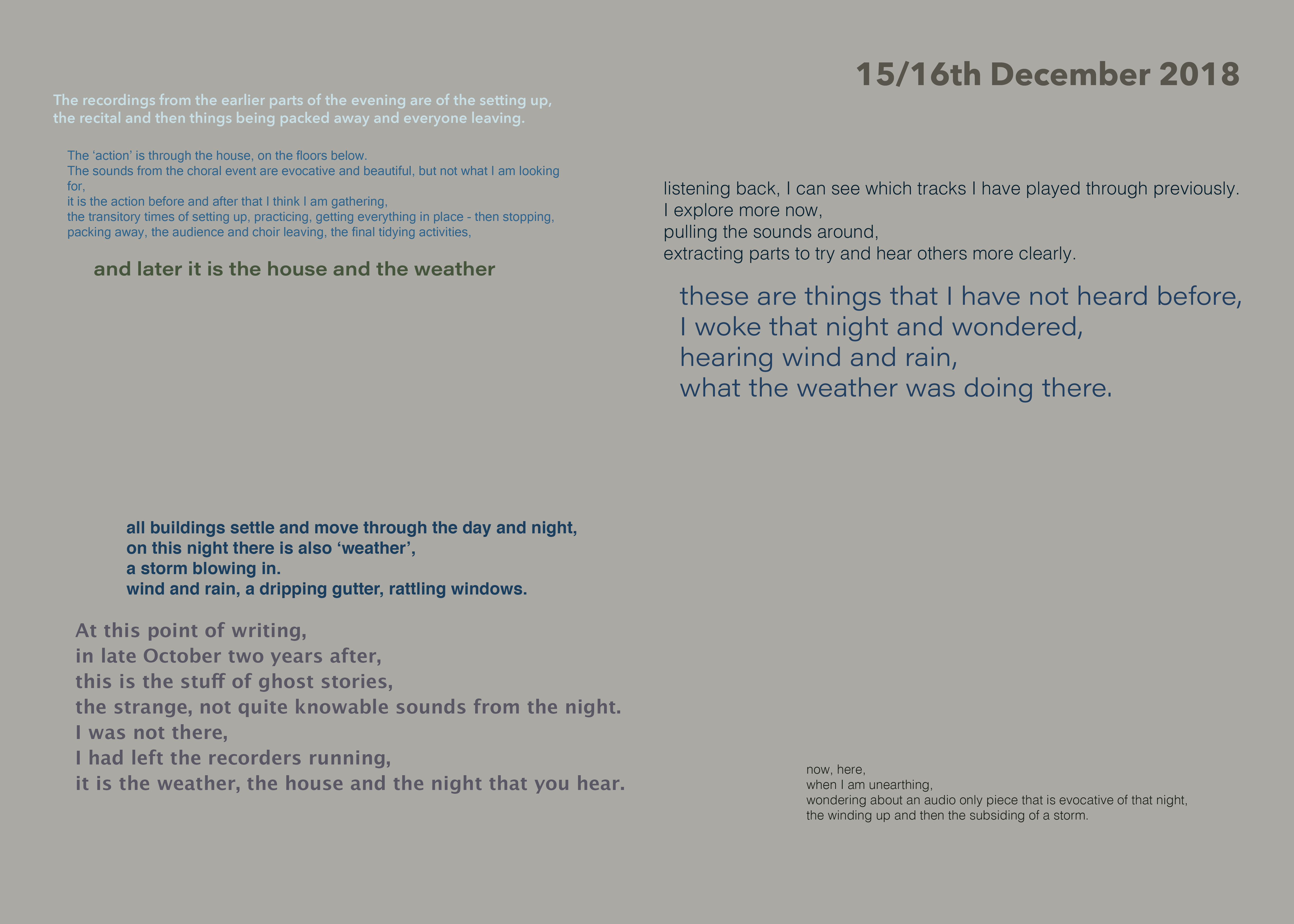 I was writing in response to the experiencing, trying not to ‘think’ it first, aiming for text that can ‘carry’ something of the/my experiencing of the audio with it, and then bringing images and text together as a ‘miasma’ that you might pick a line or word out of while visually shifting between detail and tone. I sought to generate a slippiness, to be in motion as the audio was, wanting the text to be an element that had its ‘own authority, rather than existing as a “surrogate” and as a “document”’ (Cascella 2013) of the sound.