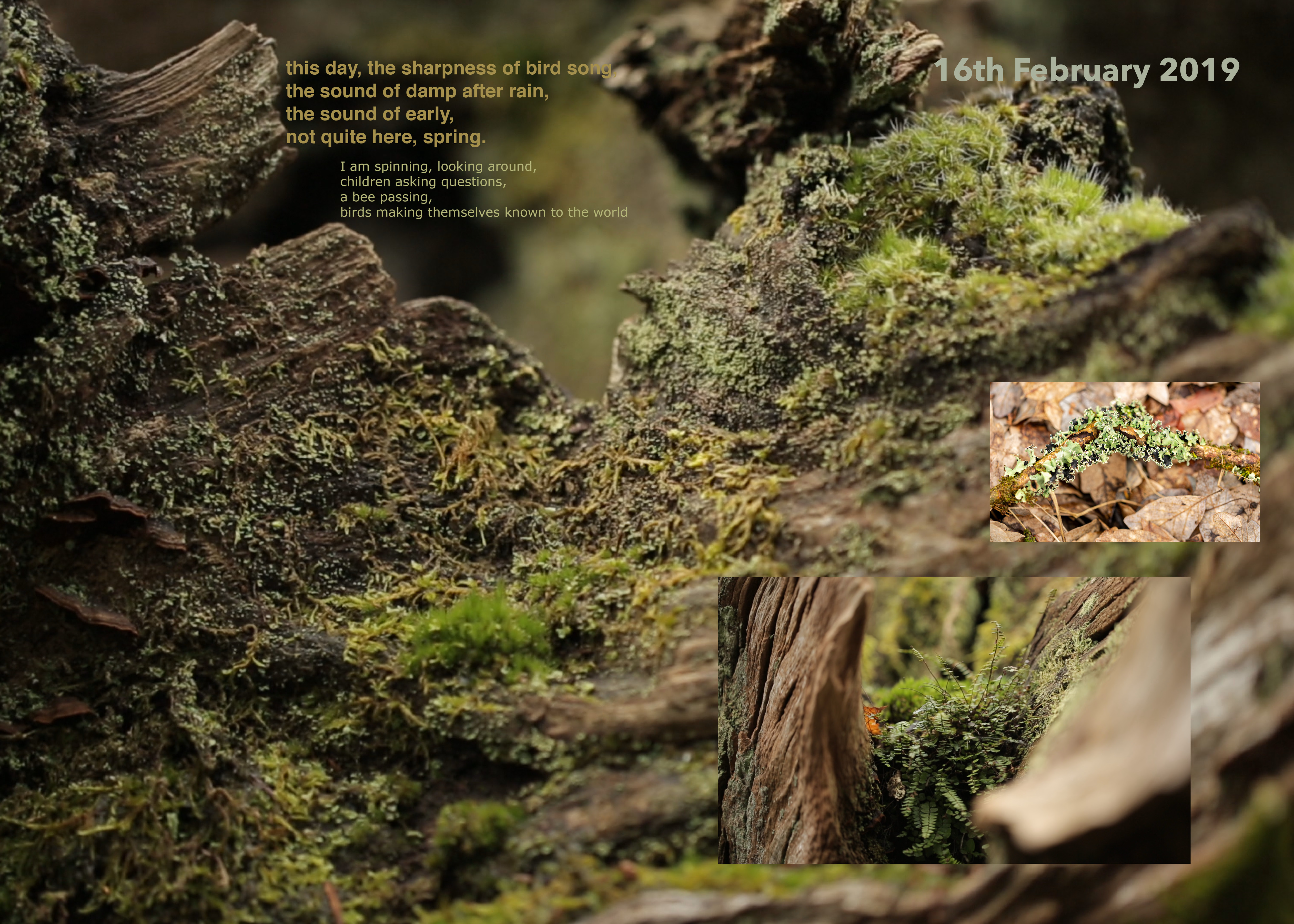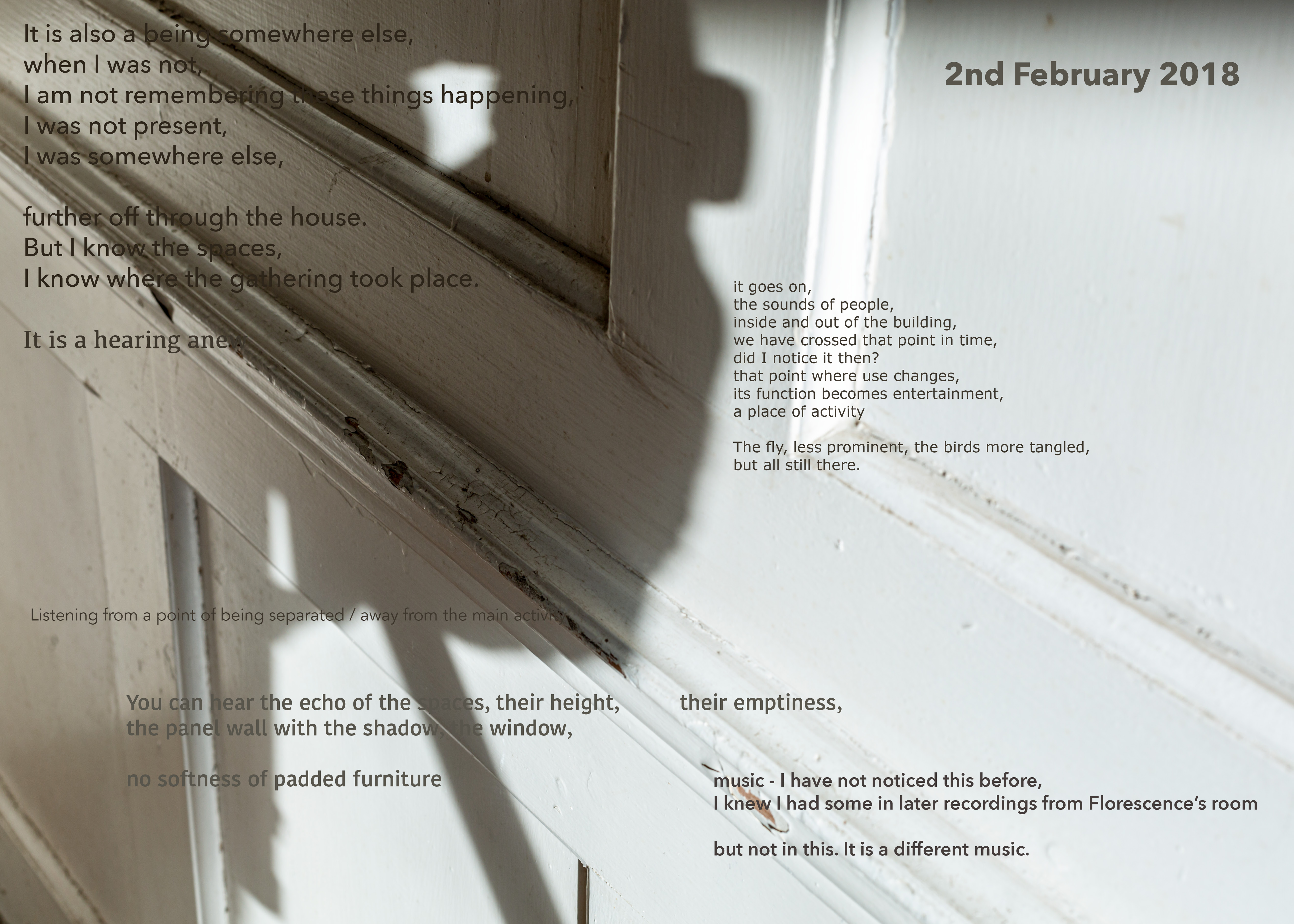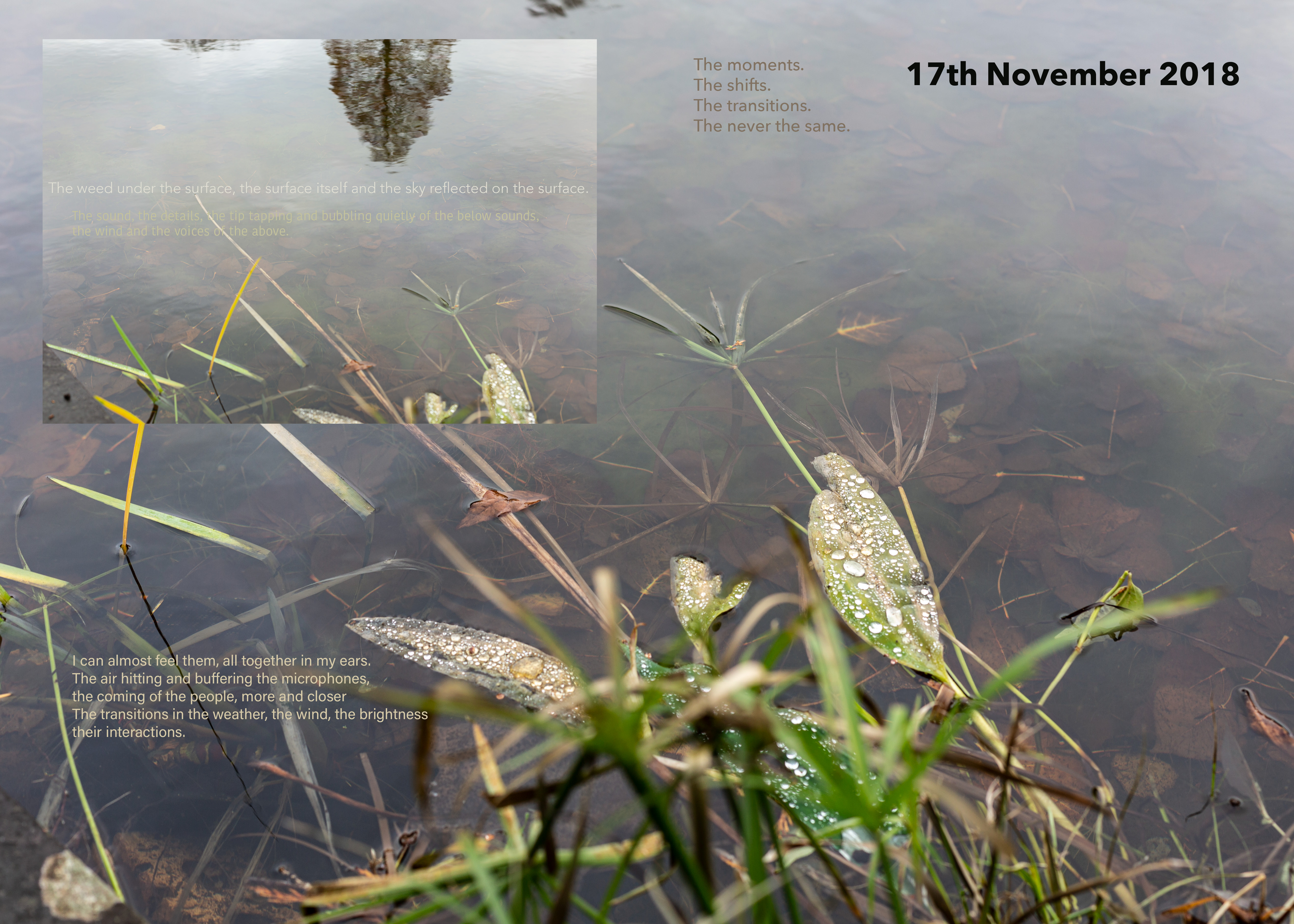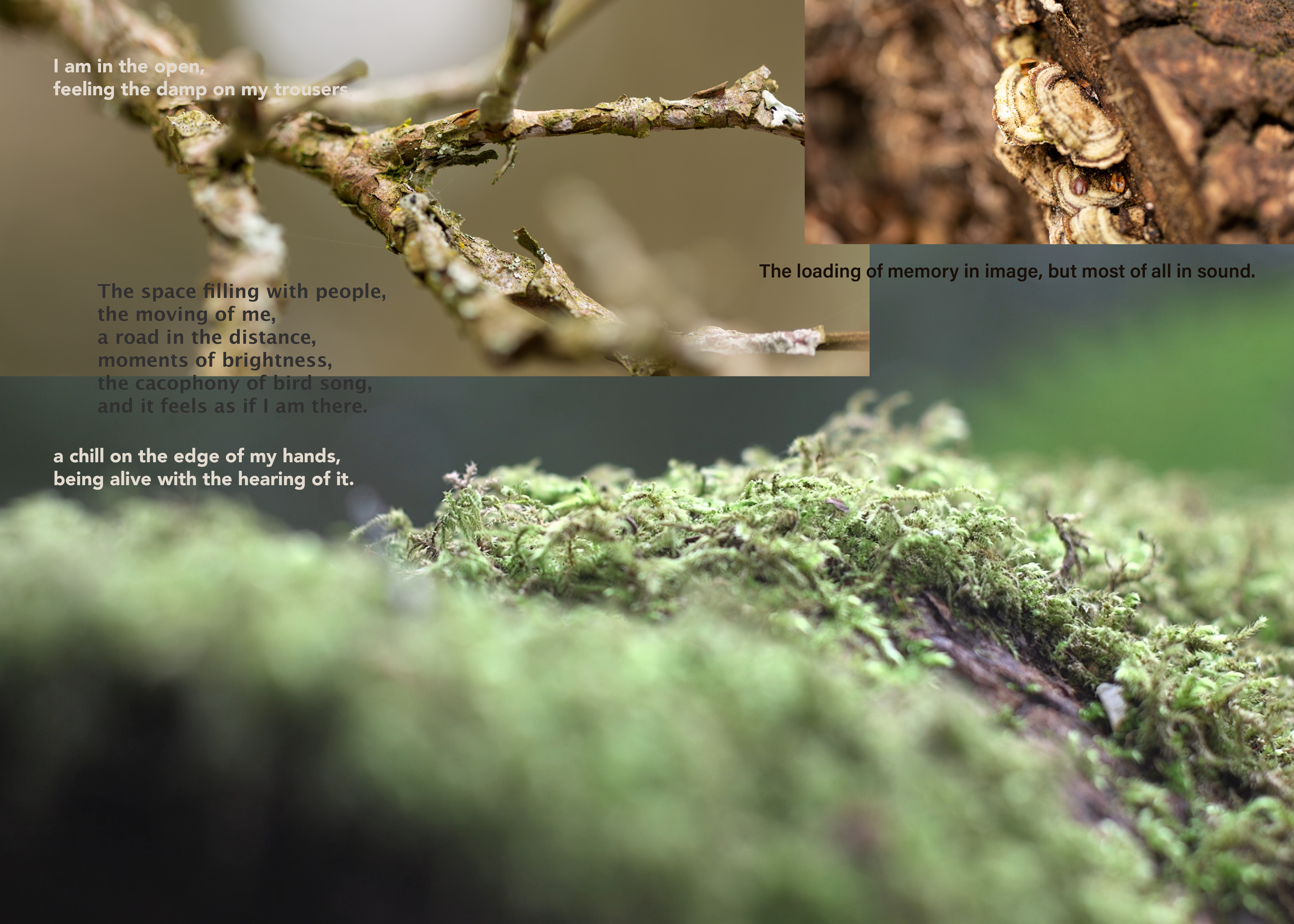 I was writing in response to the experiencing, trying not to ‘think’ it first, aiming for text that can ‘carry’ something of the/my experiencing of the audio with it, and then bringing images and text together as a ‘miasma’ that you might pick a line or word out of while visually shifting between detail and tone. I sought to generate a slippiness, to be in motion as the audio was, wanting the text to be an element that had its ‘own authority, rather than existing as a “surrogate” and as a “document”’ (Cascella 2013) of the sound.