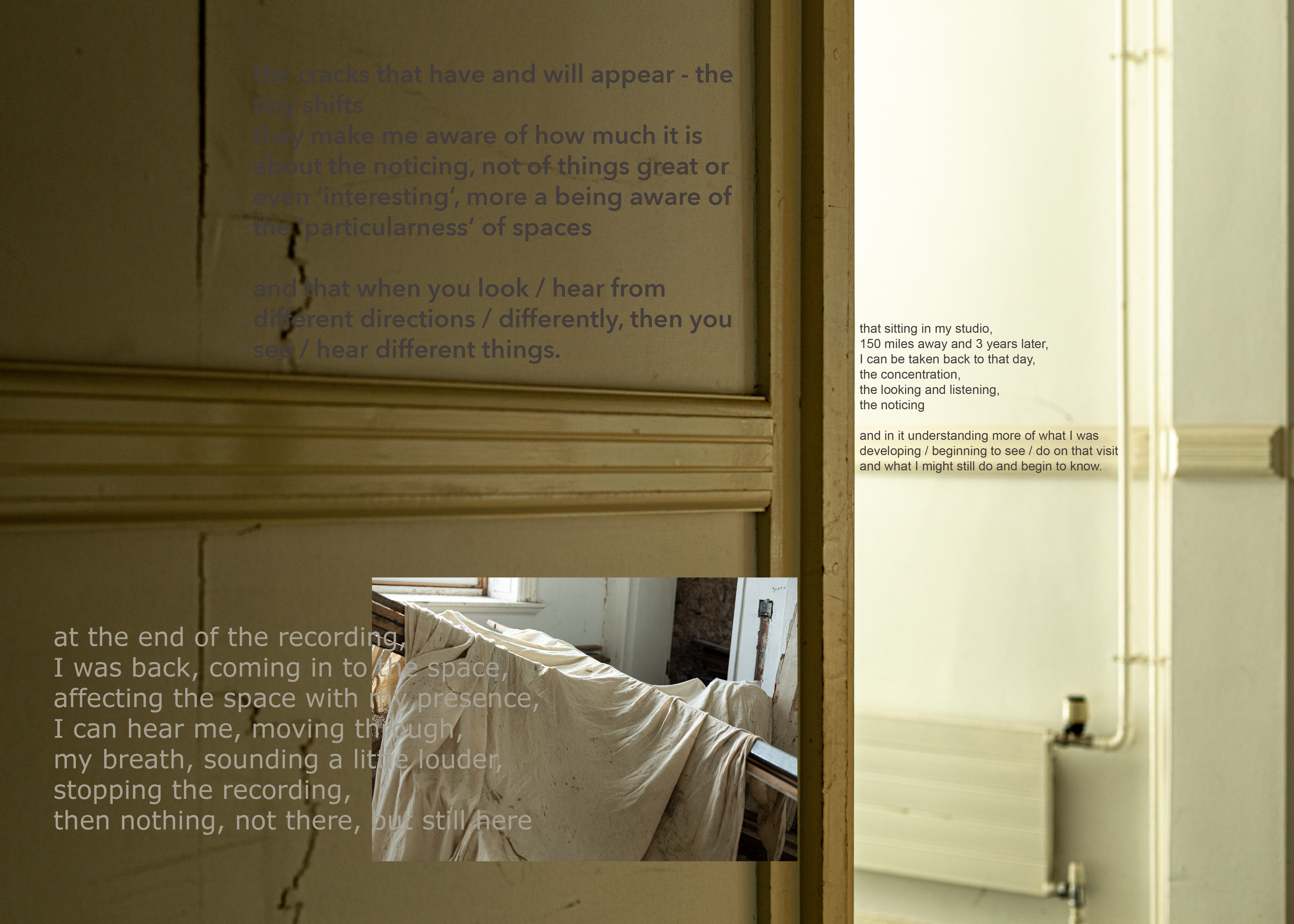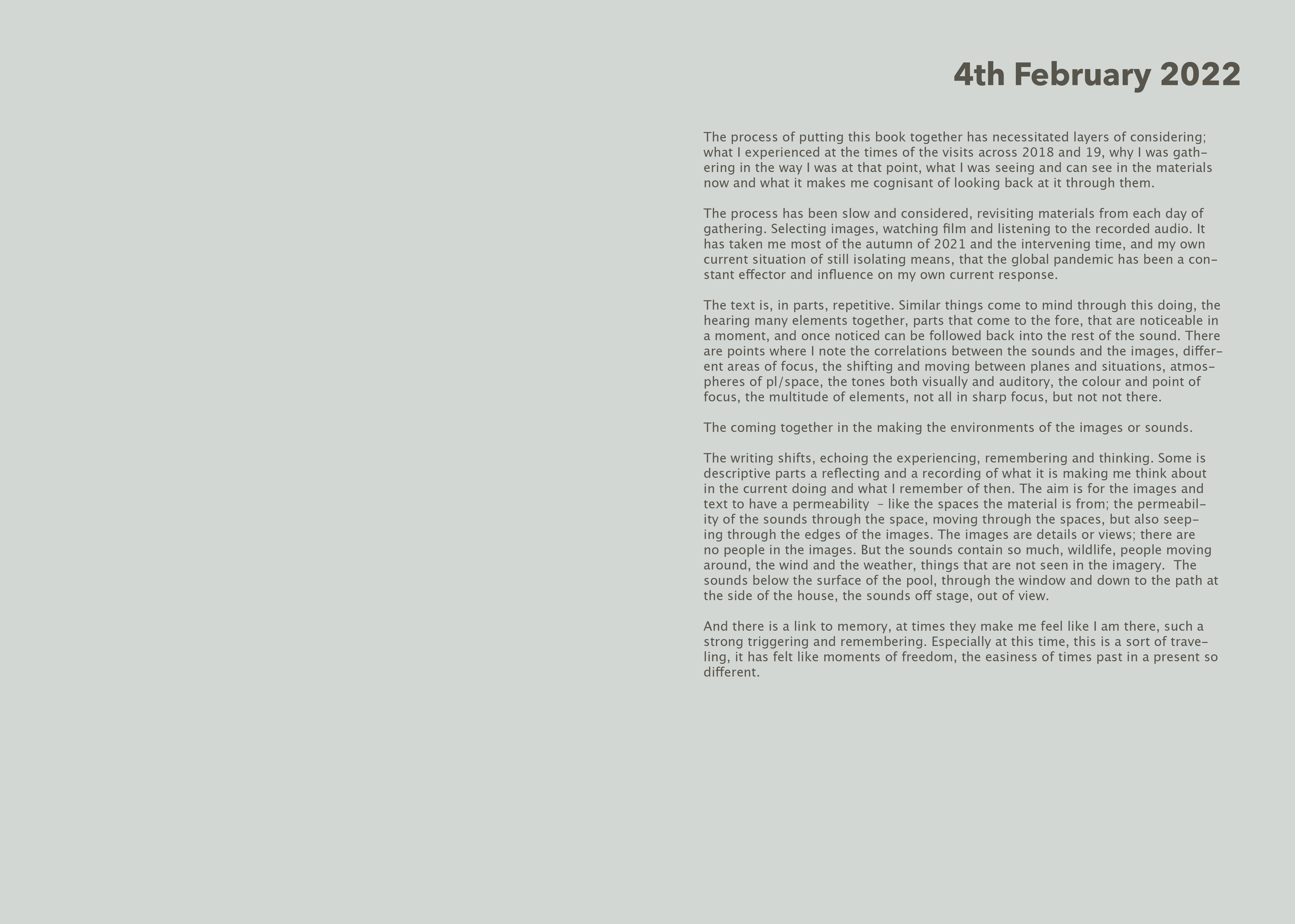 The images giving a ‘frame of reference’ to sound from the same space, the edges become permeable. The audio-visual contract (Chion 1994) is not broken as such, but shifted, image as ‘glimpse’ of where you are, the audio giving width and depth, opening an expanded field of view into a space that you can ‘envisage’, seeing what is not there in this interplay. In the book these come together as something of affect and my interior experiencing (extimacy), differently than in works in spaces, I am maybe more visibly in them.