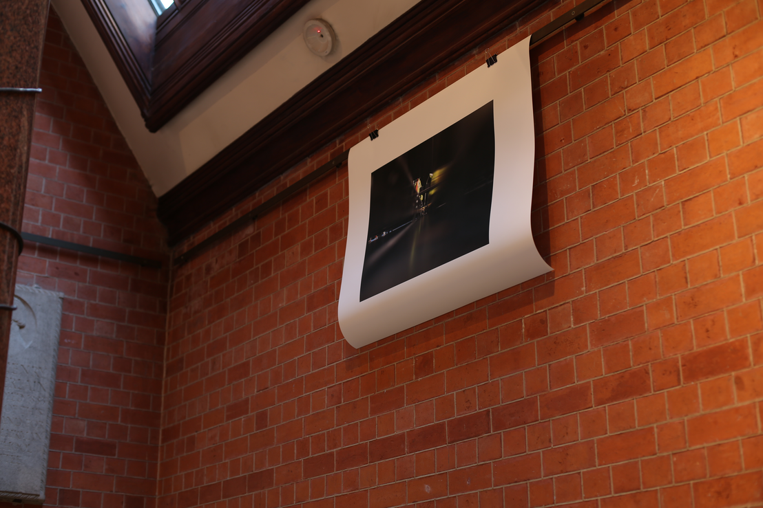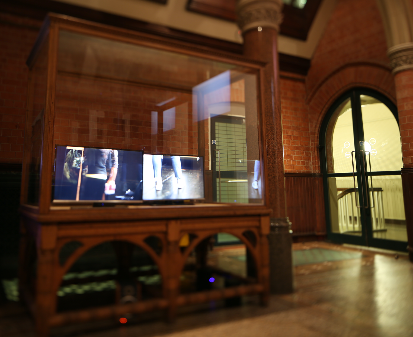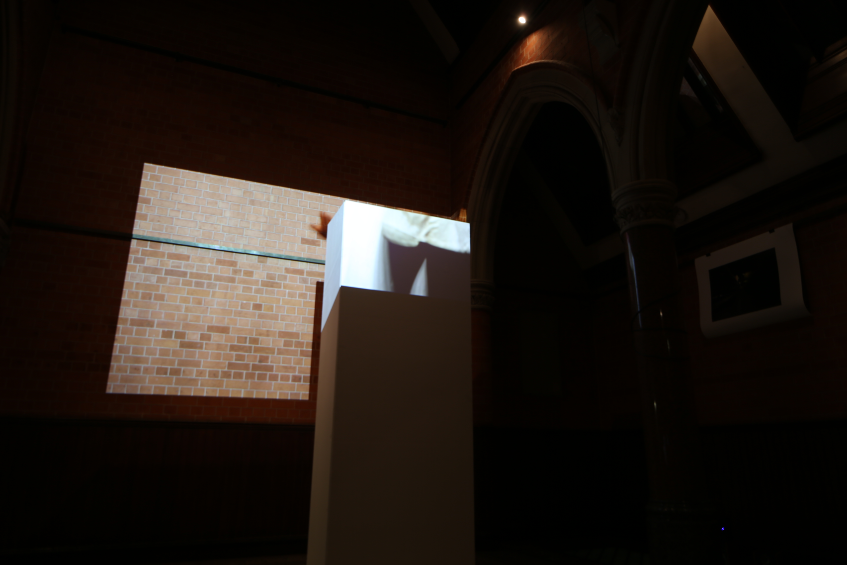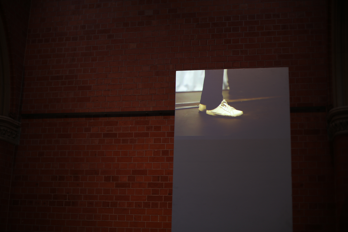 The space of the exhibition was very different from the rehearsal/stage space. The showing space at Birmingham School of Art, a Victorian Venetian gothic building, is the foyer/museum entrance space to the building. There are pillars to each side, a high ceiling that meets at an apex, and windows in the roof. It is a little like a small church, flooded with light on a bright day. Part of my scaffolding was to roughly transpose the layout of the rehearsal space to this; the point you came fully into ‘my space’ would be where James had been positioned, looking towards the main stage activity, and other elements were positioned in relation to this.