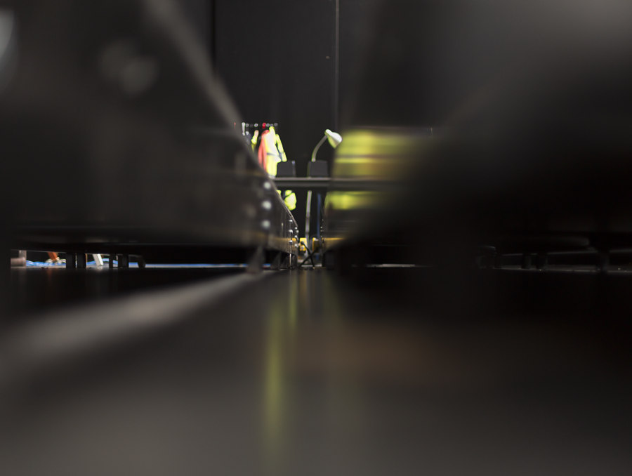 Before Stan’s started the devising process, when the ‘travelators’ had just arrived, James and I met and talked. I made some photographs of the space, one of those - with James just a yellow blur of high vis jacket, excitedly exploring the workings and structure of the travelators - became part of my exhibition. The space, that image, full of active potential, an excitement for both of us around how elements might come together. I was beginning to understand the necessity of ‘activity’, movement and shift in the works I was making, as ‘parts’ of affect, the image holds a moment of what Massumi describes as a microshock.
