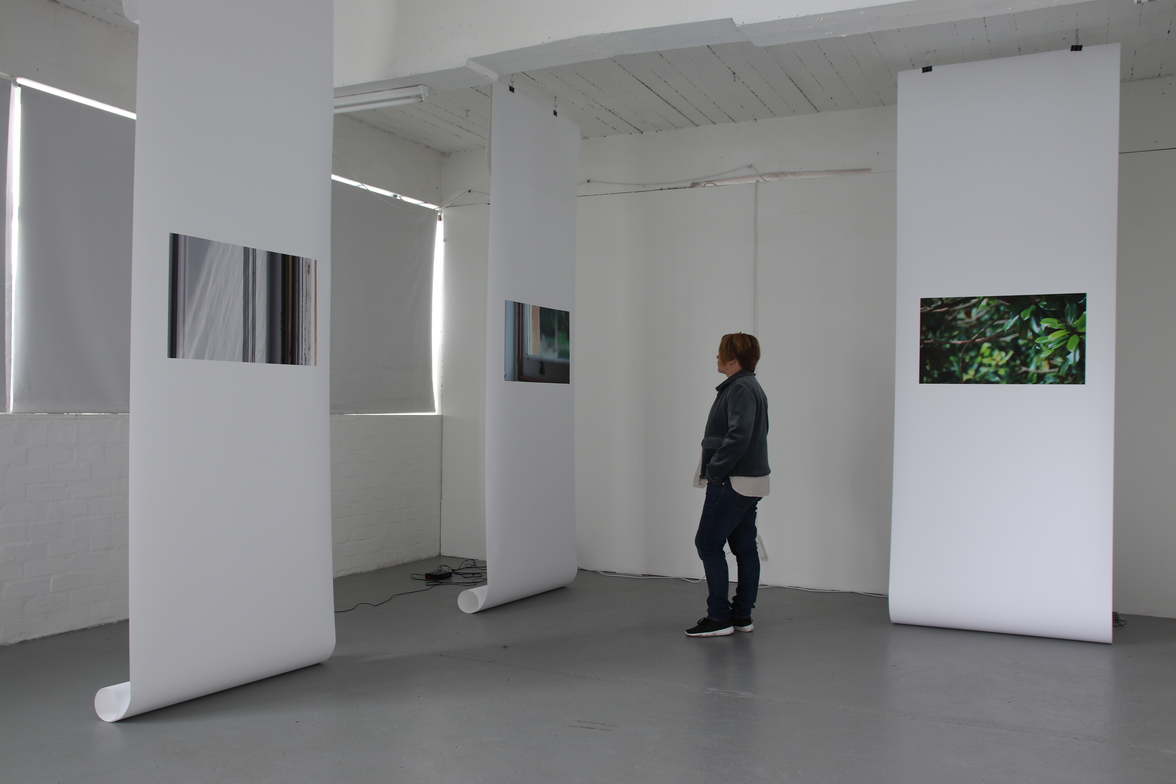 Building on the first show, I worked with the materials from Florence’s room, deciding to work in the larger space and echo the window images from Dyffryn with the gallery windows. Using this scaffold of the transposition of the layout from one space to another, gave me a simple starting point from which to explore the audio’s spatiality further. The second iteration came together as three (5m) droops of paper, with a window image printed on each (image with audio to the left) ,roughly conforming to the position they were from and around 2m from the windows in the space, so that the layers of windows highlighted each other. There were a set of speakers positioned on the floor where each piece of paper rolled up.