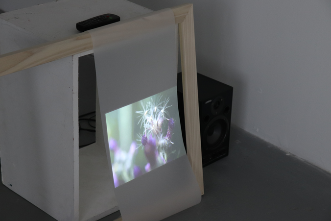 The works coalesced into areas of outside and inside. Materials from Florence’s room in the more contained and darker grey area, audio gathered across different days, with two projections of windows from the room. These made a ‘space’, with audio that mingled at the border with the sounds of the wider space and further. The bright projections enhanced the windows being full of light, but the space felt dark, too theatrical and ‘dramatic’ for the much ‘quieter’ sounds and images. As both the gallery and Florence’s room were on the first floor, when you heard the sounds through the house it felt like they could be coming from the floor below. Opposite the gallery windows were materials from the gardens, a projection of ‘Grasslands’, a screen showing ‘wood’, printed images and audio from spring and summer visits; these were smaller in scale and the sounds quiet by nature.