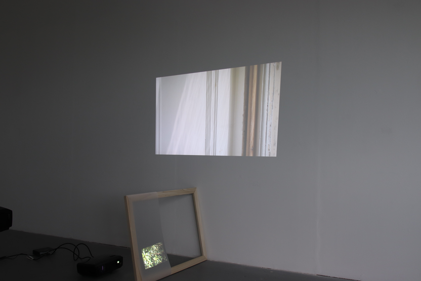 The works coalesced into areas of outside and inside. Materials from Florence’s room in the more contained and darker grey area, audio gathered across different days, with two projections of windows from the room. These made a ‘space’, with audio that mingled at the border with the sounds of the wider space and further. The bright projections enhanced the windows being full of light, but the space felt dark, too theatrical and ‘dramatic’ for the much ‘quieter’ sounds and images. As both the gallery and Florence’s room were on the first floor, when you heard the sounds through the house it felt like they could be coming from the floor below. Opposite the gallery windows were materials from the gardens, a projection of ‘Grasslands’, a screen showing ‘wood’, printed images and audio from spring and summer visits; these were smaller in scale and the sounds quiet by nature.