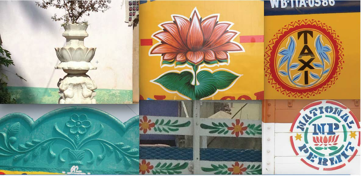 In India, plant representations are widely used as art and design elements across a range of publicly encountered surfaces and structures within the visual culture of city streets – on vehicles, walls, architectural elements such as gates and grills, and in signage material across shop fronts and on streets. The treatment of these floral and vegetal motifs is often decorative and gestural, painted in bold and bright colours, sometimes using dense layers of paint or drawn with chalk powder. These representational techniques are far removed from the scientifically precise drawing techniques associated with the conventional definitions of botanical art. Since 2008, I have been photographing these kinds of botanical motifs, encountered while travelling for work and leisure through various Indian cities.