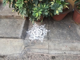 Another trajectory along which I work involves documenting images of street art and design artefacts that contributes to a personal archive of photos, gathered over a decade. This aspect of my pedagogic practice results in a systematic investigation of concepts that are drawn from these images in order to create new learning experiences. Thus, research into rangoli as an instance of street art and design has in turn been both my process and the outcome of my inquiries. I took rangoli images mostly while walking in and around the city of Bangalore, sometimes ambling in familiar territory, and other times turning into an unknown street corner. The routes by which I collected these photographs were varied.