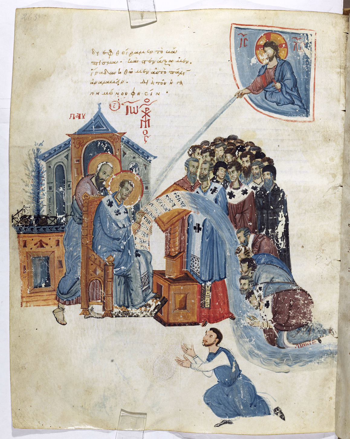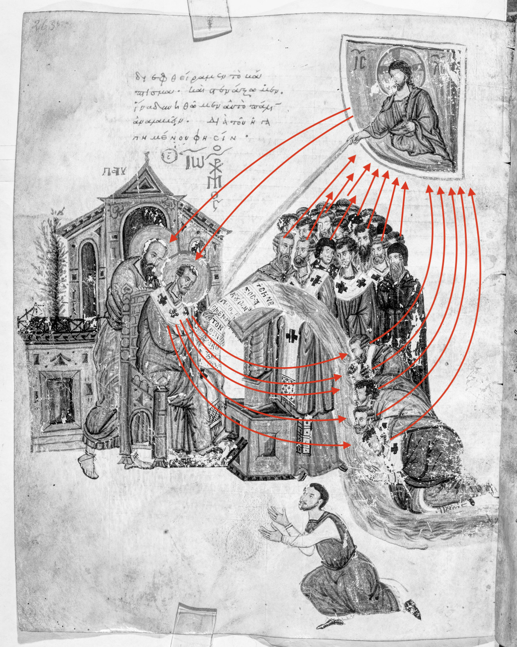 Fig. 31: Cod A 172 sup fol 236v, Veneranda Biblioteca Ambrosiana. This image from the 12. century depicts Chrysostomos, who writes Paul's Epistle to the Romans. Chrysostomos is directly inspired by a metaphysical jet. His writings become a stream symbolized in water which is drunken by bishops. This incredible book painting can be seen as an early depiction of a wonderful information flow of a specific room of perception.