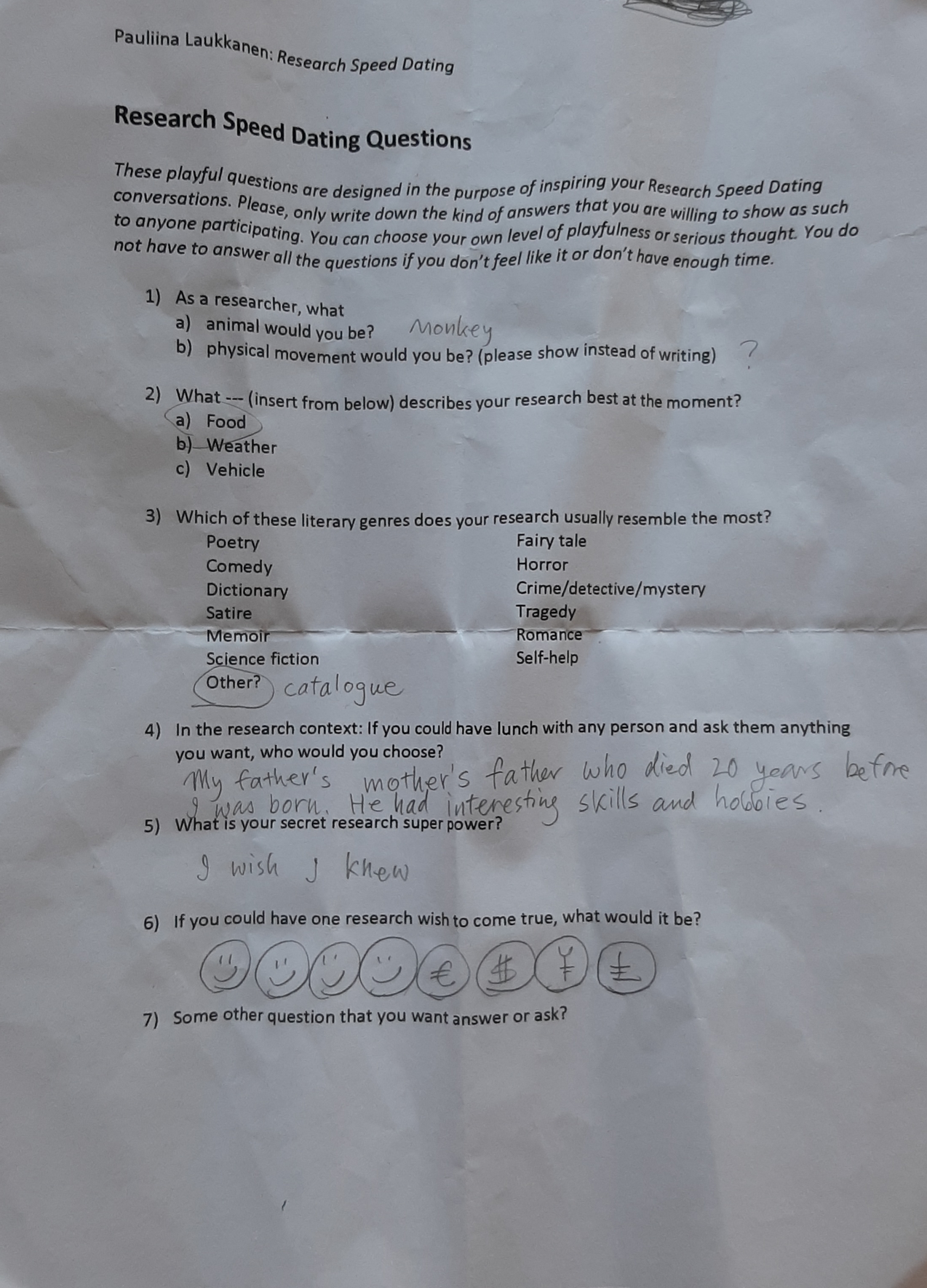 For me, the most prominent feature of the speed dates was to experience how differently each of the five conversations that I had with different people emerged and developed. It was wonderful to get a glimpse of different people’s ways of thinking and approaching things. And I did not realize I was a researcher kangaroo until I wrote it down!