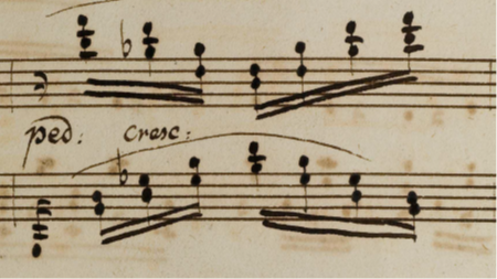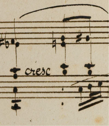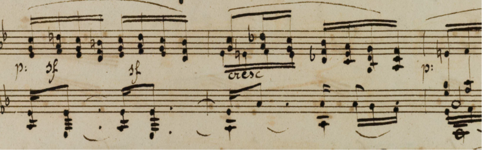 here is the opening of the manuscript of this movement. In it, each hand is given a dynamic, and while the expressive and rhetoric markings (sf and staccato) belong to the right hand, these should not influence the simplicity of the left hand. But perhaps Beethoven wrote a crescendo in bar 4 because the left hand leaves the right hand alone so as to expose the chromatic line more clearly, thus creating a gap in the sound – filled by the crescendo. I do not think this crescendo should bring any tension with it – and the density of the diminished chord, in its voicing, brings enough power so as to not overdo it. I also think that the novelty of the larger two-bar slur is prioritary to the other parameters. It would seem rather ungraceful to have such a lilting motion and long movement be stopped so early in its course.