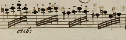 At the same spot (bar 5) appear crescendi in the violin part, but they also coincide with a change in rhythm : slurs in the violin part are less frequent (they were playing appogiaturas on every eigth note until then). Slurs would indicate an emphasis on the slurred notes, but now that they disappear, one must compensate in terms of volume. Therefore, a crescendo is written, despite none of the staccato dots turning into the stronger staccato lines. I think that the drop to G natural also shows a softening texture on that note compared to the accidental G sharp. The crescendo is both a very local indication (for the same A-s) and a more global, structural direction given to the variation. 3.1.6.2