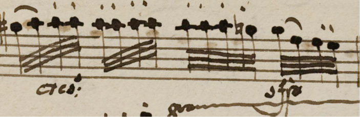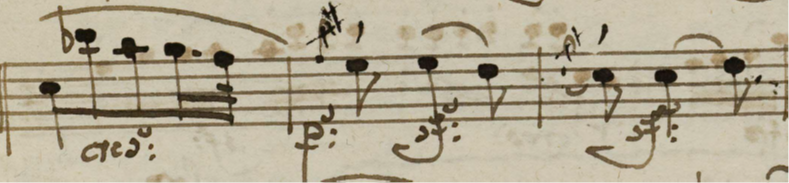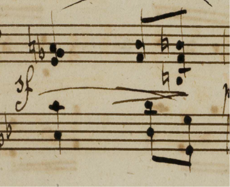 Beethoven seems to have made a very serious point about this in his famous letter to Holz the second violinist of the Schuppanzigh quartet about the op.132 quartet in 1825 (Beethoven 2010: 1379), concerning the use of staccato lines in his music. The correction Beethoven made here should be respected, so as to avoid putting an accent on the following very low chord, and give the sense of a resolution to the preceding crescendo. On the other hand, the violin does not really ‘arrive’ to the A : a new phrase begins there, emphasized with an expressive, drawn (and not written out) crescendo swell (we have one hypermetric unit finishing and another beginning : this is classical ambiguity at its finest and simplest : what does a resolution mean ?