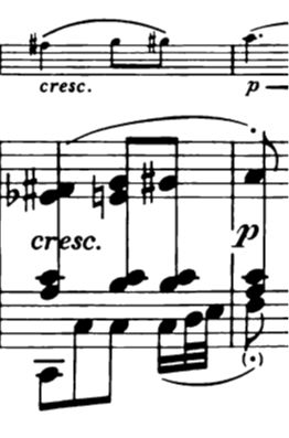 The seemingly peaceful opening of the movement is both contradicted and confirmed by a V-pedal (a stagnation on a tense chord=an harmonic oxymoron) throughout the first hypermeter (mm.1-4), only to be broken by the crescendo and sudden rise of the pedal, influenced by the chromatic motion of the right hand. All parameters seem to be leading toward a (this time) truly peaceful phrase, with softly moving harmony : indeed it is what we have in the following bars (b.6)