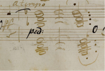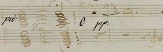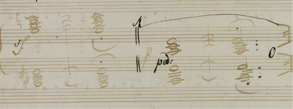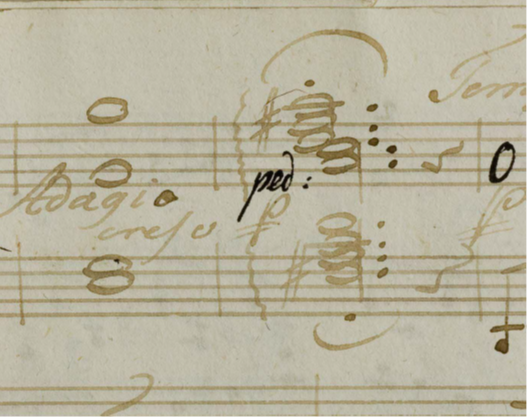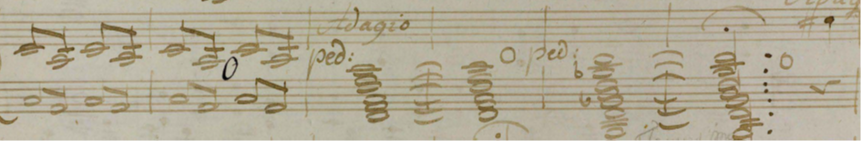 the motivic relationship between this bar and bar 574-5 of the piano part must be brought to the foreground (e-c-a ; c-a-f), and could indicate that the Adagio bar 575 is not sudden but prepared by the blurring of the piano’s tremolo through pedal, but the manuscript shows something different from the Henle Edition: