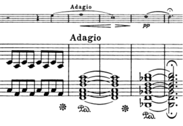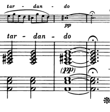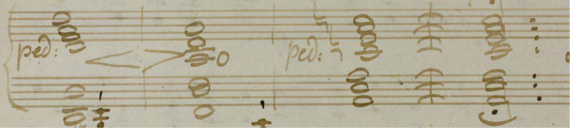 The fact that the ‘decresc’ marking has been delayed shows the sudden quality of this fermata : had it been more prepared by a longer decrescendo, it’d have been shorter and still within the decrescendo gesture. Since the now longer crescendo is proof that the gesture is now bigger than a simple ebb-and-flow (meaning that we leave the dynamic we had at the beginning of the crescendo, as Kitchen puts it in the difference between a diamond swell and an ‘open’ swell), the pp could be seen as a subito, with the ‘inégal’ offbeat slurs turning into a very pale and ambiguous (emphasis on the main beat (eigth note)+ emphasis on the beginning of the swell= agogic oxymoron) figuration.