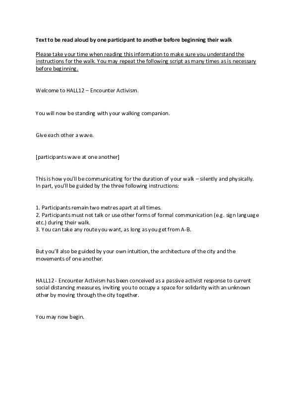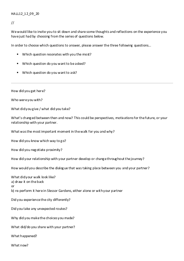 "[This walk has inspired future walks], where once the precedent has been set for non-verbal shared walks in the spirit of mutual solidarity, future walks can embrace deepened quietude and feel safe without needing to communicate ourselves verbally. We both expressed a desire for that sort of mutualism to be more abundant (...)."