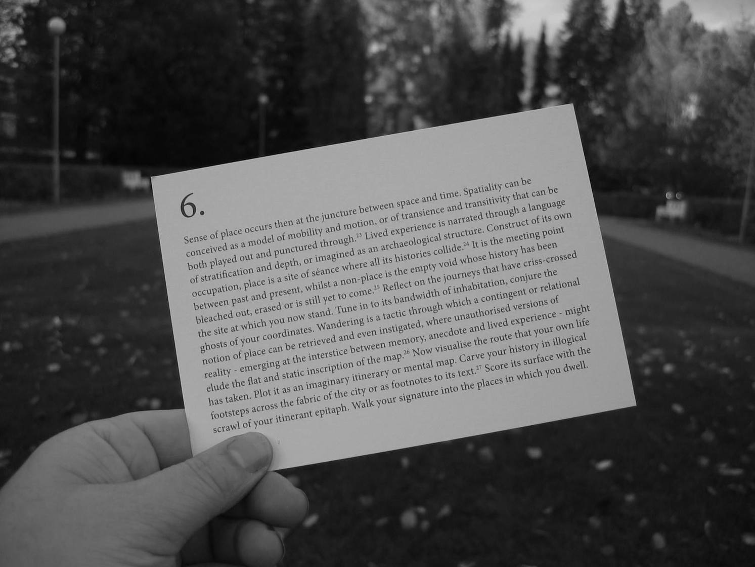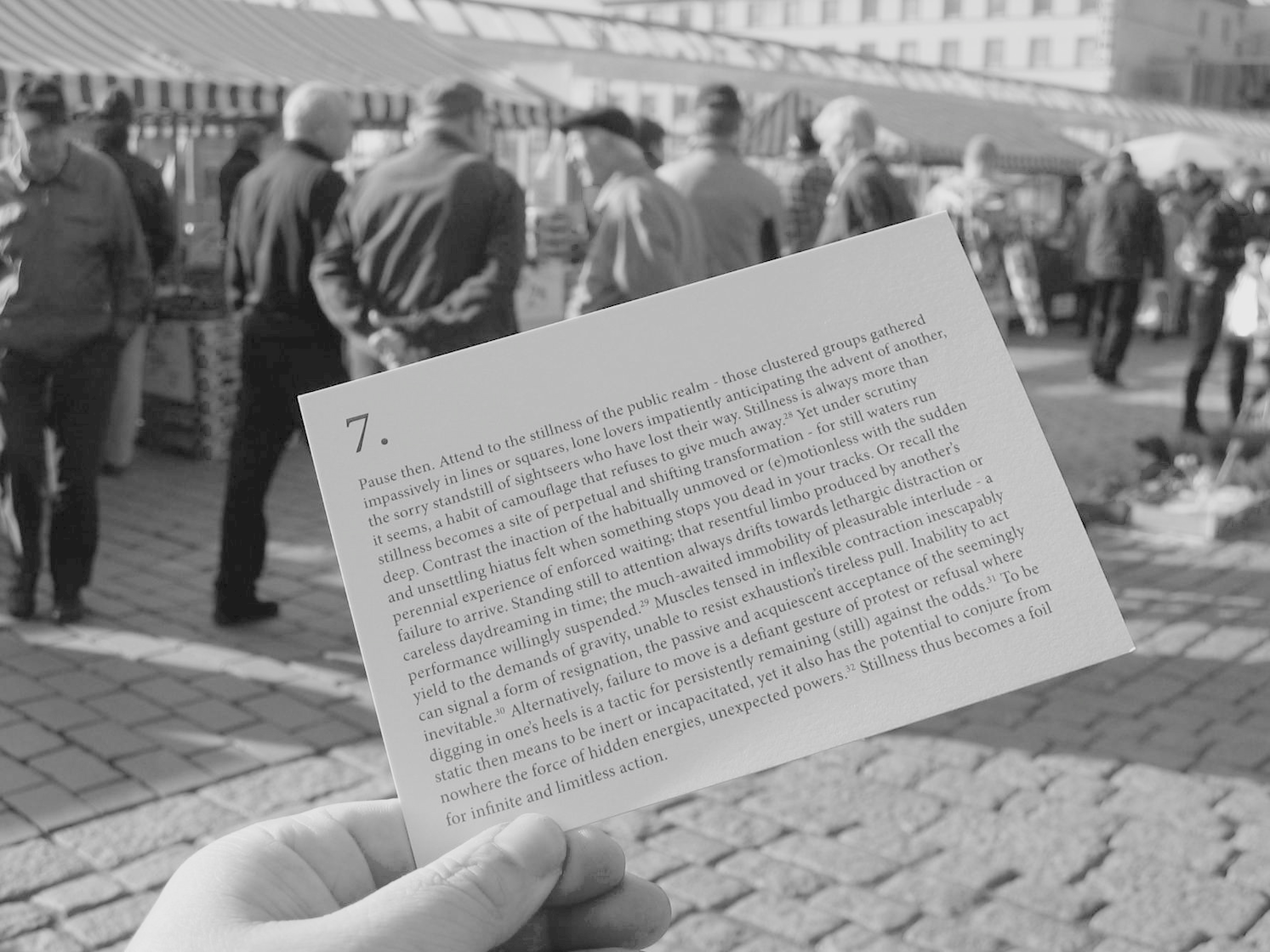 The concerns explored in Card 7 and Card 8 were elaborated as part of a journal article 'From Passivity to Potential: The Communitas of Stillness' which was subsequently developed as a chapter entitled, 'Performing Stillness: Community in Waiting', published in Stillness in a Mobile World, (eds.) David Bissell and Gillian Fuller (Routledge, 2010). Drawing on the experience of working in collaboration with the artist-led project, Open City, this chapter explores the potential of an active and resistant - rather than passive and acquiescent – form of stillness that can be activated strategically within a performance-based practice. I investigate the potential within forms of stillness specifically produced in and by contemporary capitalism, by reflecting on how they might be (re)inhabited as sites of critical action. With reference to the writing of Gilles Deleuze – especially in relation to Spinoza’s Ethics – the article explores how the asignifying or affective possibilities produced by the collective performance of stillness can be understood as a mode of playful resistance to or refusal of habitual social norms as well as additionally producing the germinal conditions for a nascent community of experience no longer bound by existing protocol, a model of “communitas” emerging from the shared act of being still.