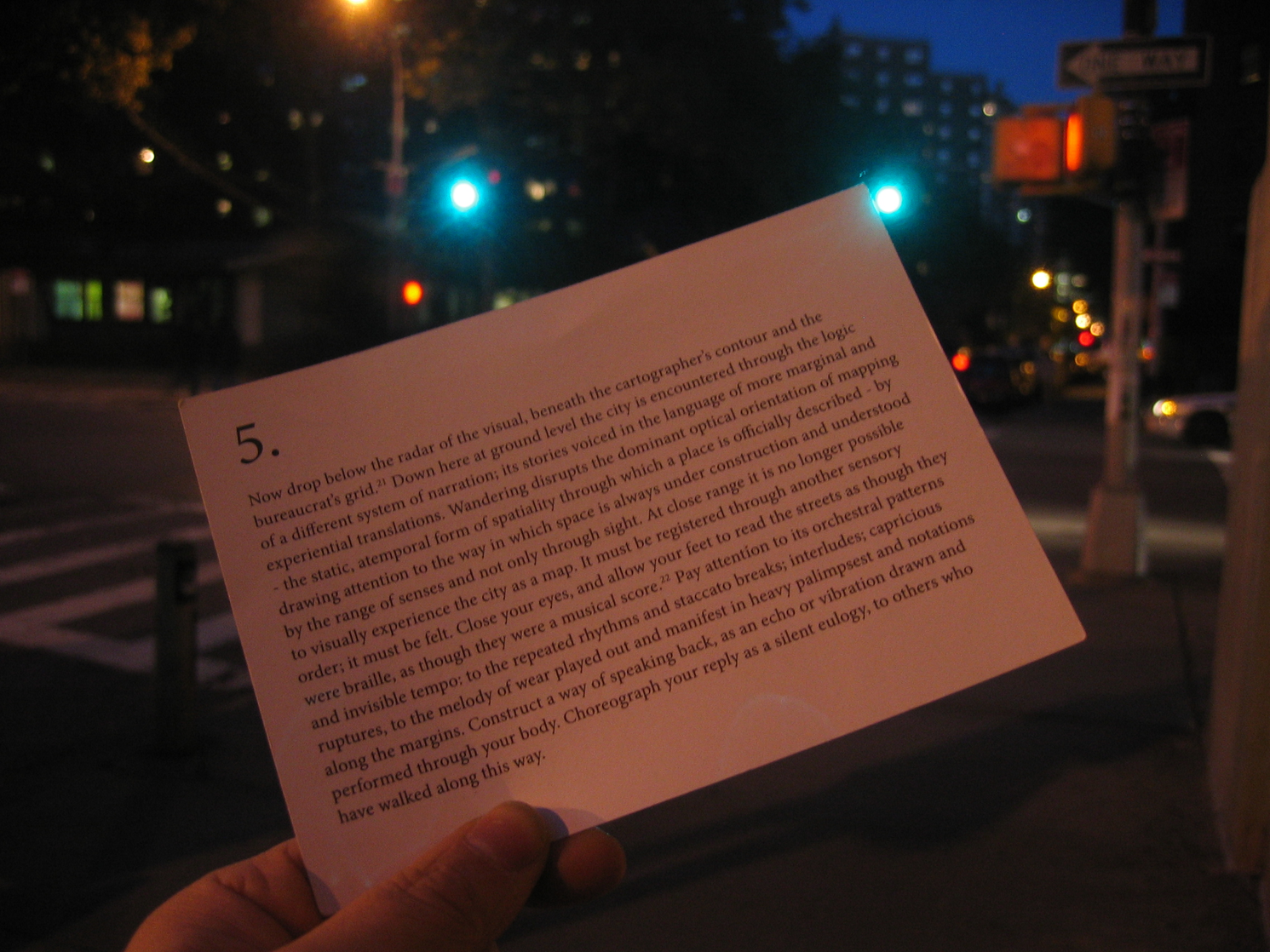 Increasingly I have become interested in how the meaning of the text might be changed or modified depending upon its siting. In 2009, re-contextualised the content of the cards as part of my involvement in Anti festival, Art, Site, Language. I presented a paper on my collaboration with Open City which was subsequently developed as a journal article for Rhizomes, Hives, Tribes and Collectivities entitled, R.S.V.P - Choreographing Collectivity through invitation and response.