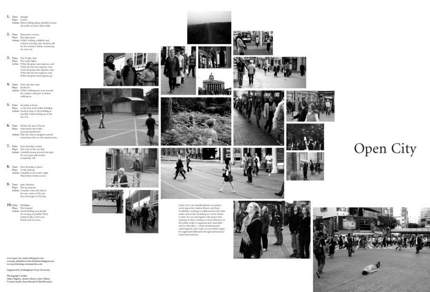 Open City’s projects often involve inviting, instructing or working with different individuals to create participatory performances in the public realm, discrete art works that put into question or destabilize habitual patterns and conventions of public behaviour. In 2007, I was invited by Open City to produce a piece of writing in response to their work for a series of publicly distributed postcards, and have since worked more collaboratively with the project on a phase of research investigating how the different temporalities within the public realm might be harnessed or activated creatively; how movement and mobility affect the way in which place and locality are encountered or understood.