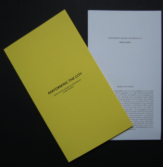 Performing the City (2012) is an artists’ bookwork that brings together material from Movement and the City, an ongoing research project-workshop led by Bianca Scliar Mancini and Sara Wookey, and Experiments Along the Brink of I, a prose response by myself [Emma Cocker] to witnessing and participating in Movement and the City workshops in Zagreg (2009) and Toronto (2010)"