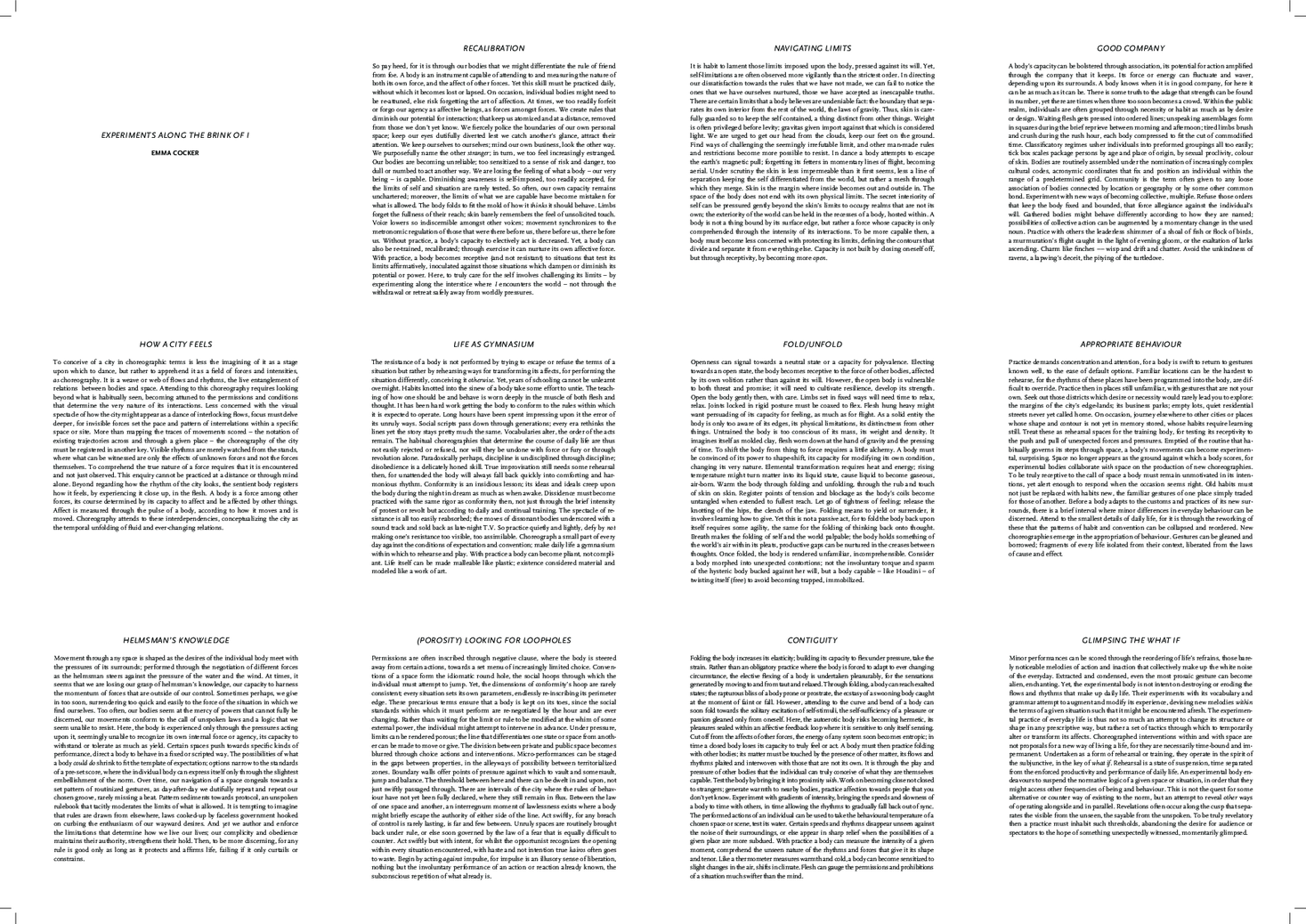 Experiments Along the Brink of I is an example of ‘contiguous writing’ whose content evolved and emerged from a position of proximity, from being-with another’s practice, from working alongside and experiencing from within.