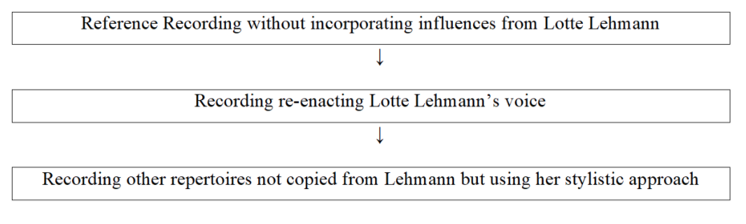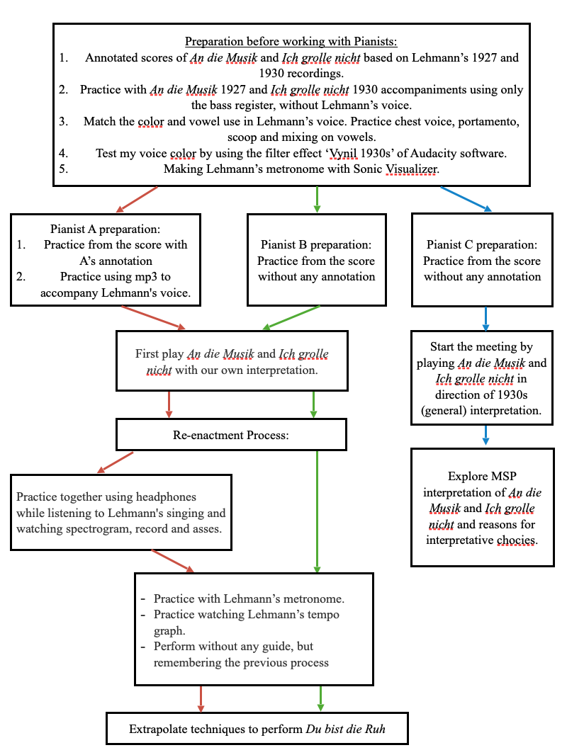 I copied the musical performance on Lehmann’s recording of An die Musik (1927) by Franz Schubert and Ich grolle nicht (1930) by Robert Schumann. I tried different methods in exploring the re-enactment process with pianist A and B. I also worked with pianist C to explore pre-war style (without listening to recorded originals) and in preparing versions that fit the mainstream practices current today. The outcome of this process resulted in recordings of further repertoire including Du bist die Ruh by Schubert extrapolated from Lehmann’s performance style.