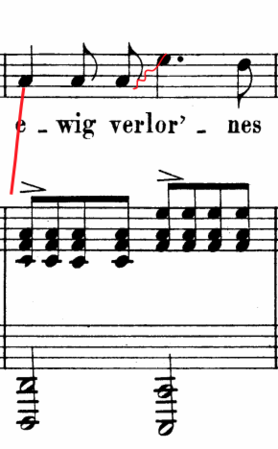 Figure 4.10 above shows Lehmann’s portamento over a major second in bar 11. These descending portamenti appear five times, while the ascending portamento is only found once in bar 7. Figure 4.11 above shows how in bar 7 Lehmann sings ‘verlor-nes’ over an ascending portamento. This ascending portamento is of the portamento schnell type which sounds lighter compare to her descending portamento. Due to the quick shifting, this ascending portamento sounds more like the heavy scoop that connects the legato line.