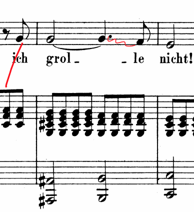 Lehmann starts her 1st verse and 2nd verse “Ich grolle nicht” in bar 1 and bar 19 with chest voice. She emphasizes the entirety of the word “grolle” (grudge) by stressing the consonant ‘gr’. In bars 23-29 Lehmann creates a bright color that creates different nuances from the previous verse. In these bars, the bright color sounds like a representation of her dreams and memory of her lover. Lehmann carries all of the long notes with a stable vibrato.
