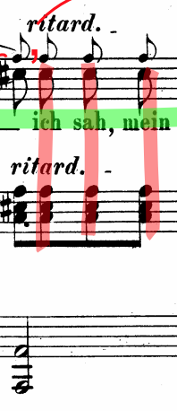 The fluctuating tempo is shown in figure 4.14. The spectrogram in bar 12-16 shows how the average tempo of around 68 bpm accelerates to 118 bpm. This faster tempo appears when in the lyrics, the protagonist speaks directly to her lover: ‘Wie du auch strahlst in Diamantenpracht, es fällt kein Strahl in deines Herzens Nacht’ (how you gleam in diamond splendour, no ray falls in the night of your heart.)