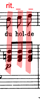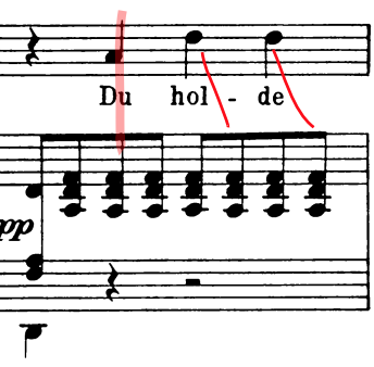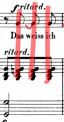 Figure 4.6 and 4.7 represent the places where Lehmann sings unsynchronized with the accompaniment, which often happens at the beginning of the phrase. In Figure 4.7, Lehmann anticipates her entrance and lingers almost a full half note longer on the word of ‘sweet’ (süßer).