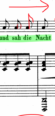 The tempo mark of this song is “nicht zu schnell” (not too fast), whereas Lehmann sings this song in 65bpm with a tendency to slow down. Lehmann’s tempo marking in the 1930 recording fits the recording made of her reciting the poem’s rhythmic pattern.