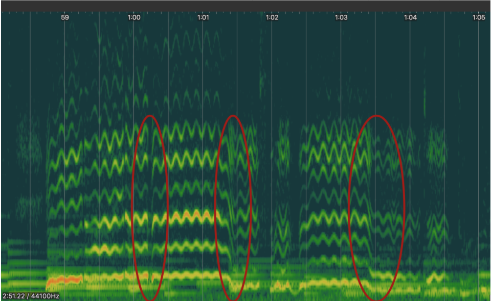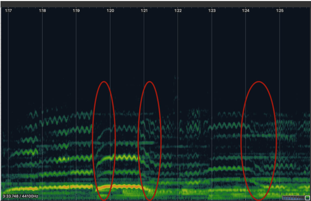 The two spectrograms below show the difference in Lehmann’s portamento in bars 17-18 in the year of 1927 and 1947.