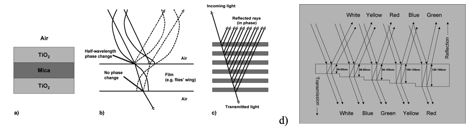 In pictorial art, pigments have been used since time immemorial. However, natural colours are not only of pigmentary (or chemical) origin but often have a physical (or structural) basis. The mechanisms causing each type of colouration are fundamentally different. A substance containing pigments, such as paint, is a light-scattering material in which a certain chemical component selectively absorbs in a specific section of the visible wavelength range. The colour impression, the remaining part of the light, changes neither hue nor brightness, even when viewed from different angles. Structural colour, on the other hand, is caused by light interacting with transparent, colourless nanostructures that selectively reflect light in a certain wavelength range. Here colours are made visible via the optical phenomenon of light interference, resulting in a colour that changes with the direction of illumination and viewing angle. Although numerous attempts have been made to capture the visual impression of structurally coloured animals in painting: “... colours of this type, by their very nature, defy our best efforts at visual reproduction.”