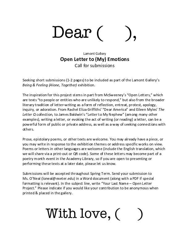 Letters are a powerful form of personal and political address. Open Letters responded to the work, as well as to the many open letters in spring 2020 which were sent to arts organizations about the pandemic-induced layoffs of arts and cultural workers and the critical need for racial justice, among others.