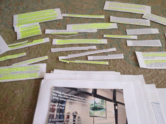The gallery’s placement in an academic quad, on the corner of a well-traveled road (used by pedestrians, bicycles, and cars). Its location invites student gallery proctors, adult collaborators from campus, and public visitors in to participate as the process unfolds. People frequently come in to observe, help, comment, or give input (the research conversations for this project fostered this interchange in an intentional way). Everyone has a different opinion or perspective, each intertwined with my developing understanding of the project. Embracing this polyphony is a form of commonplacing.