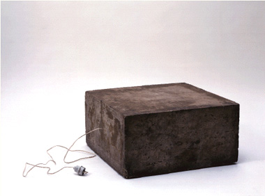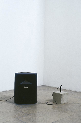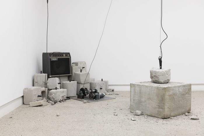 In Basanta’s piece, one concrete block is rigged with a kinetic pulley system that is attached to the gallery’s ceiling. At the top of this block, the handle of a microphone peeks out and is connected to the pulley system. The block ascends, slowly, dangling in the air. Once it reaches its prescribed altitude, the rock plummets towards the floor, landing on a large concrete podium with a loud crash. Pieces of the block scatter as a result of the impact. After a resonant pause, the block is then hoisted up again, continuing the cycle until there is little left to destroy. It is then replaced by one of the many other entombed microphones that are positioned in the corner of the gallery. In irregular intervals the gallery alternates from a muted space of anticipation to a domain of noisy uneasiness. In the typically muted white cube exhibition space the intermittent sound is a disruption that is inflicted on its listeners, violating the codes of behavior prescribed by the gallery context. As articulated in Basanta’s own description of the work, the installation further registers a critique of mass broadcast through the destruction of its tools. Through this process he suggests a means to break free from an overwhelming and oppressive climate of information media.
