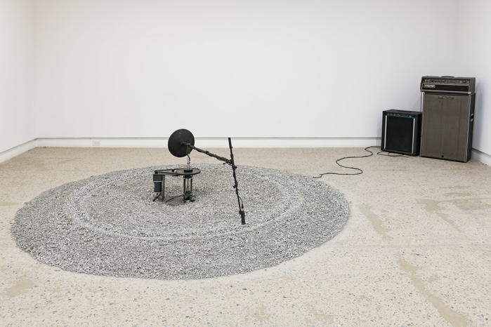 For Pugliese and Basanta multiple meanings are enfolded within the basic instruments used for public address (the microphone and the speaker). Combined with noise sounds, these components symbolize a combined potential as tools of both resistance and suppression. Basanta pointedly describes the microphone as “an indispensable instrument of the modern demagogue” (Basanta 2019) but also proposes feedback as a oppositional strategy that disrupts flows of sonic information. He subverts these tools of mass broadcast by substituting the human voice in favor of atonal ringing. He further considers the technologies of sound production, noise, and power in a more recent work, A Large Inscription, A Great Noise (2019). A two part installation, A Large Inscription is composed of the raw materials of sound and stone. A microphone mounted on a stand that slowly spins is positioned in the center of a circle of gravel; it is extended downwards into the pile of stones and rotates slowly but consistently, emitting a muffled grating sound. The rotating mic is connected to an amplifier that is positioned in the corner of the gallery. The rotation of the mic and its labored soundtrack are Sisyphean in their drudgery and perpetualness. Situated within the typically muted exhibition space, the constant sound is vexing, yet eventually becomes predictable.