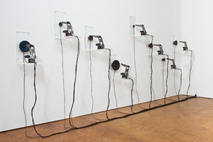 Italian artist Roberto Pugliese employs the same principles of feedback, particularly in his 2011 piece Equilibrium. Composed of metal, acrylic, microphones, motors, and electronic circuits, Equilibrium harnesses the phenomenon of feedback to engender a sense of unease within its listener. The work’s plastic supports are mounted to the gallery wall in an L shape. A microphone is affixed to a moving robotic arm which is attached to the bracket that also holds an audio cone. The installation’s kinetics allow the microphone to modify and vary its distance from the speaker. Within each pairing, the size, power, and resonance of the speaker cone varies, nuancing the sound that each assemblage emits. As Pugliese describes, “When a microphone is located in the vicinity of a cone it induces the system to go into feedback mode bringing it to the saturation of the signal, and subsequently to [a] breaking point” (Pugliese 2011). He goes on to explain, “In this way, each micro system seeks – without finding it – its own equilibrium, which is physically impossible to obtain. The Larsen effect, usually perceived as an annoying error, becomes the driving force behind the work.” Pugliese, who was trained in Italy as a composer, deploys feedback specifically as his sonic material, creating a soundscape that is at once pleasantly dynamic and mercurial. The equilibrium the assemblage seeks is also sought by its listener. The mechanization of the work further reduces the control of the listener, which adds to its insidiousness.