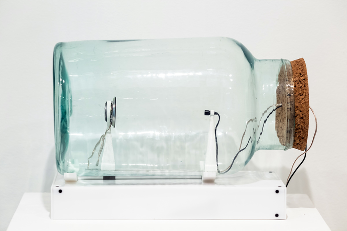 Vessel (2015)consists of a diminutive lavalier microphone and a small speaker cone placed inside a large glass jar that is sealed with a cork. The speaker traverses the container, its movement governed by a linear metal track. The speaker advances and retreats from the mic at irregular intervals, which directly and immediately alters a tone of self-generated feedback. The jar is its own enclosed acoustic environment, and the sound that fills it is the outcome of the object’s natural resonance. Only through headphones are gallery visitors able to enter the jar’s sonic space.