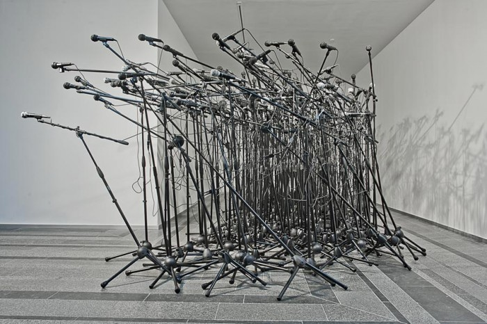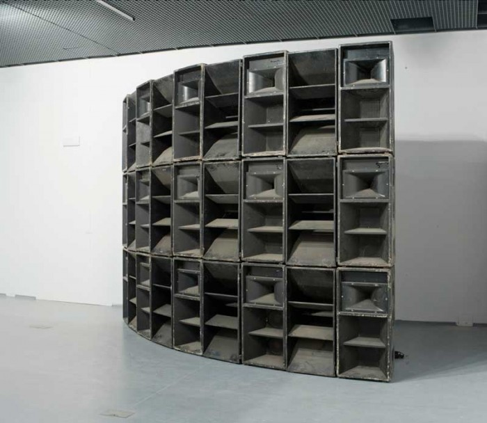 The central thematics of Vessel recalls The End of Radio (2012) by Polish artist Konrad Smoleński, which assembles approximately 200 microphones that emit a signal rather than receiving one, or Microphones (2007) in which the Mexican-Canadian electronic artist Rafael Lozano-Hemmer embeds speakers inside his microphones so that they can capture and emit sound. Like Basanta, it is Smoleński’s intention to reverse the primary function of the microphone in order to reflect on and resist the over-saturation of our media landscape. Smoleński’s installation fills the gallery with a soundscape of noisy interference. This cacophony is caused by the microphones that feed off each other and foist the results onto the listener. The title of the piece is based on a song by the American noise rock band Shellac. The song’s lyrics repeat “Can You Hear Me Now? Can You Hear Me Now?” as the band’s members question whether a message can be transmitted in the absence of a listener. The End of Radio creates an aggressive atmosphere that gallery visitors may find disturbing. A similar sense of sonic invasion is conjured by Smoleński’s sound sculpture There’s No God (2009) which consists of a wall of dilapidated speakers. The use of speakers is a recurring motif in his work, appearing often in large quantities, “evok[ing] a mix of anxiety, disorientation, and awe” (Kedmey 2014). As Smoleński writes, “After all of the elements have been connected, the assembly gives out a characteristic, monotonous hiss, or ‘dirty’ electrical noise caused by [the] poor quality of the components and high amplification without a source of signal” (Smoleński 2010). This work, like many of Smoleński’s works, including his 2013 contribution to the Venice Biennale Everything Was Forever, Until It Was No More, inspires a sense of expectation, inescapable dread, and tension, elicited through ear-piercing sounds.