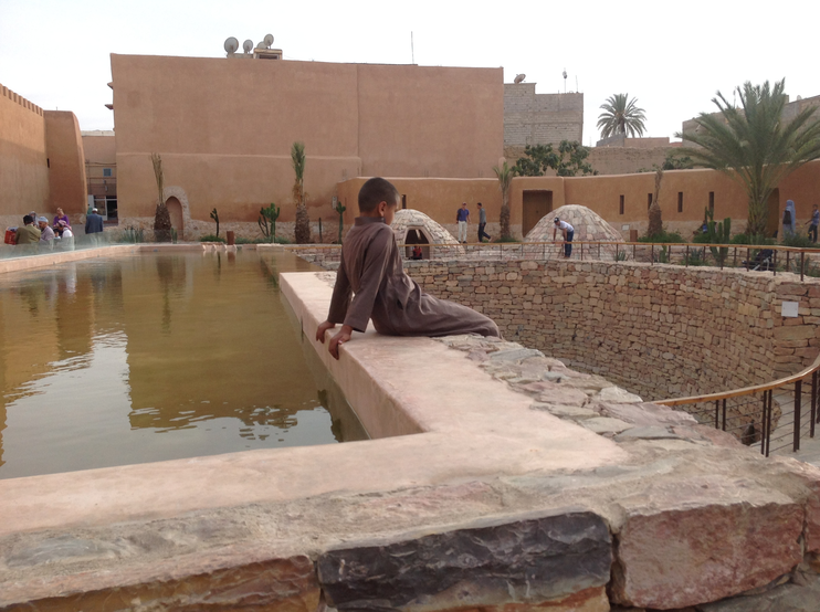 In a recent ambition to make the history of the city comprehensible, the municipality of Tiznit launched a vast project to rehabilitate the ancient city. The project included several spaces and buildings, and among them the Source Bleue was at the center of interest (Naji 2013). Conceived as the site in which a tangible and intangible heritage intersects, the Source Bleue has become a place where memories of collective founding institutions (Goeury 2018) are superimposed onto the memories of female fertility rituals (Naji, Goeury and Boumzgou 2016). In 2015, Naji responds to this by proposing a new staging of the spring, surrounded by a small public garden (Fig. 2). Naji attempts to recall the history through evincing it in the atmosphere of the oasis, with water flow and birdsong (Naji and Goeury 2020).